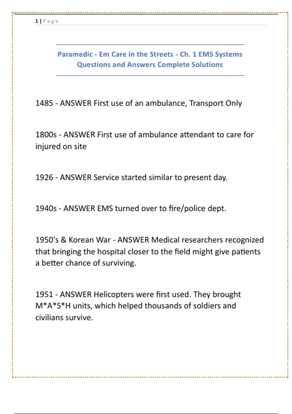 Paramedic - Em Care in the Streets - Ch. 1 EMS Systems Questions and Answers Complete Solutions