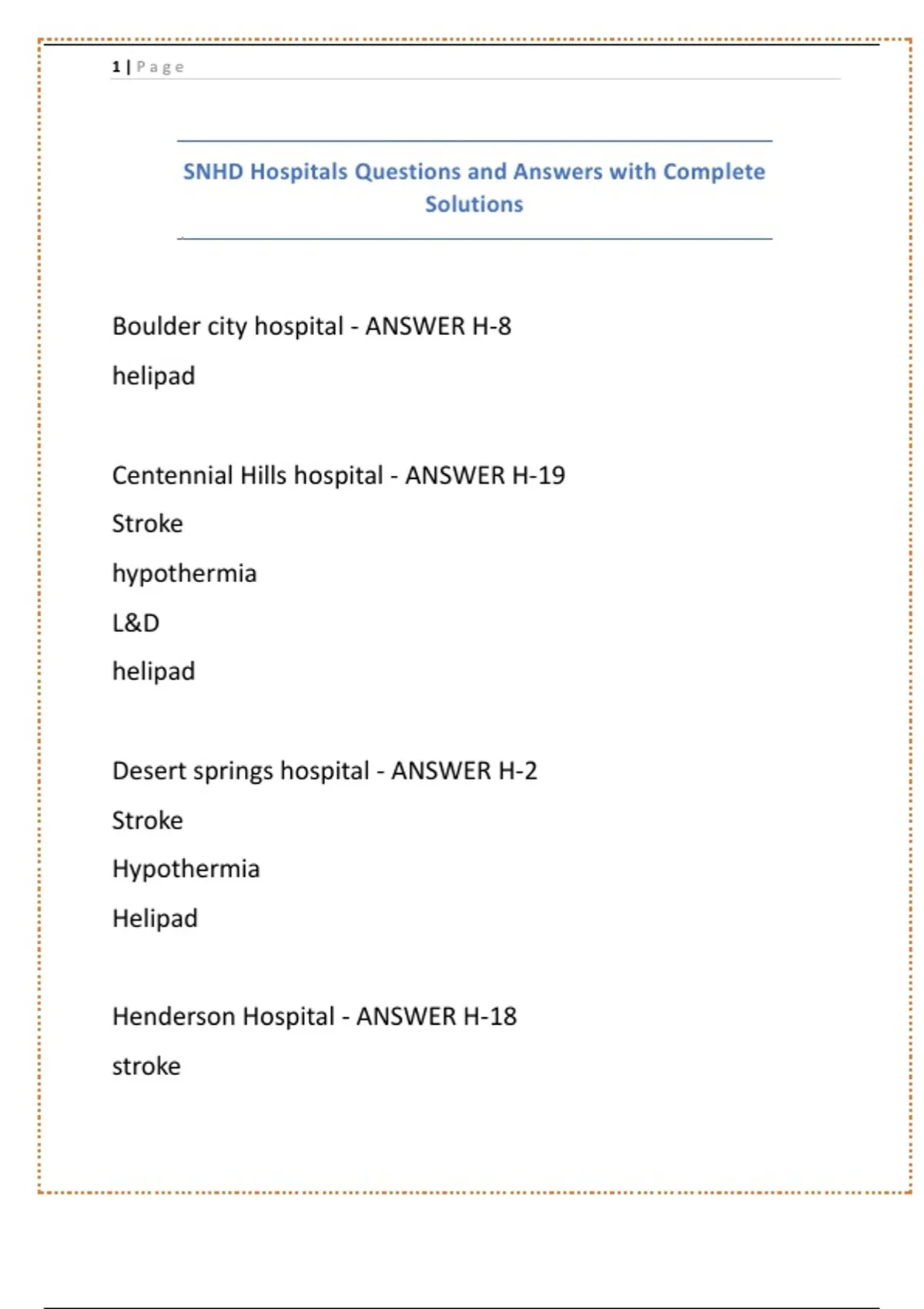 SNHD Hospitals Questions and Answers with Complete