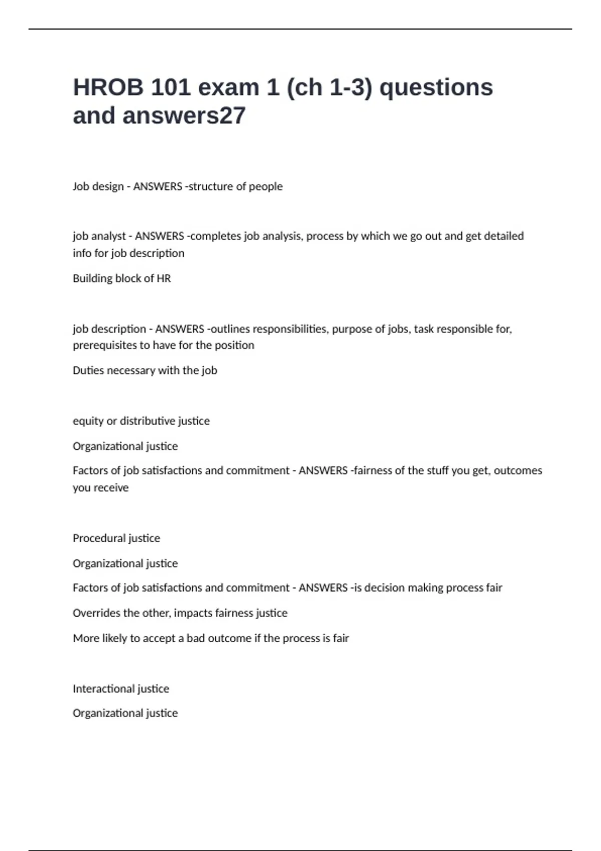 HROB 101 exam 1 (ch 1-3) questions and answers Job design - ANSWERS -structure of people job analyst - ANSWERS -completes job analysis, process by which we go out and get detailed info for job description Building block of HR job description - ANSWERS -outlines responsibilities, purpose of jobs, task responsible for, prerequisites to have for the position Duties necessary with the job equity or distributive justice Organizational justice Factors of job satisfactions and commitment - ANSWERS -fairness of the stuff you get, outcomes you receive Procedural justice Organizational justice Factors of job satisfactions and commitment - ANSWERS -is decision making process fair Overrides the other, impacts fairness justice More likely to accept a bad outcome if the process is fair Interactional justice Organizational justice