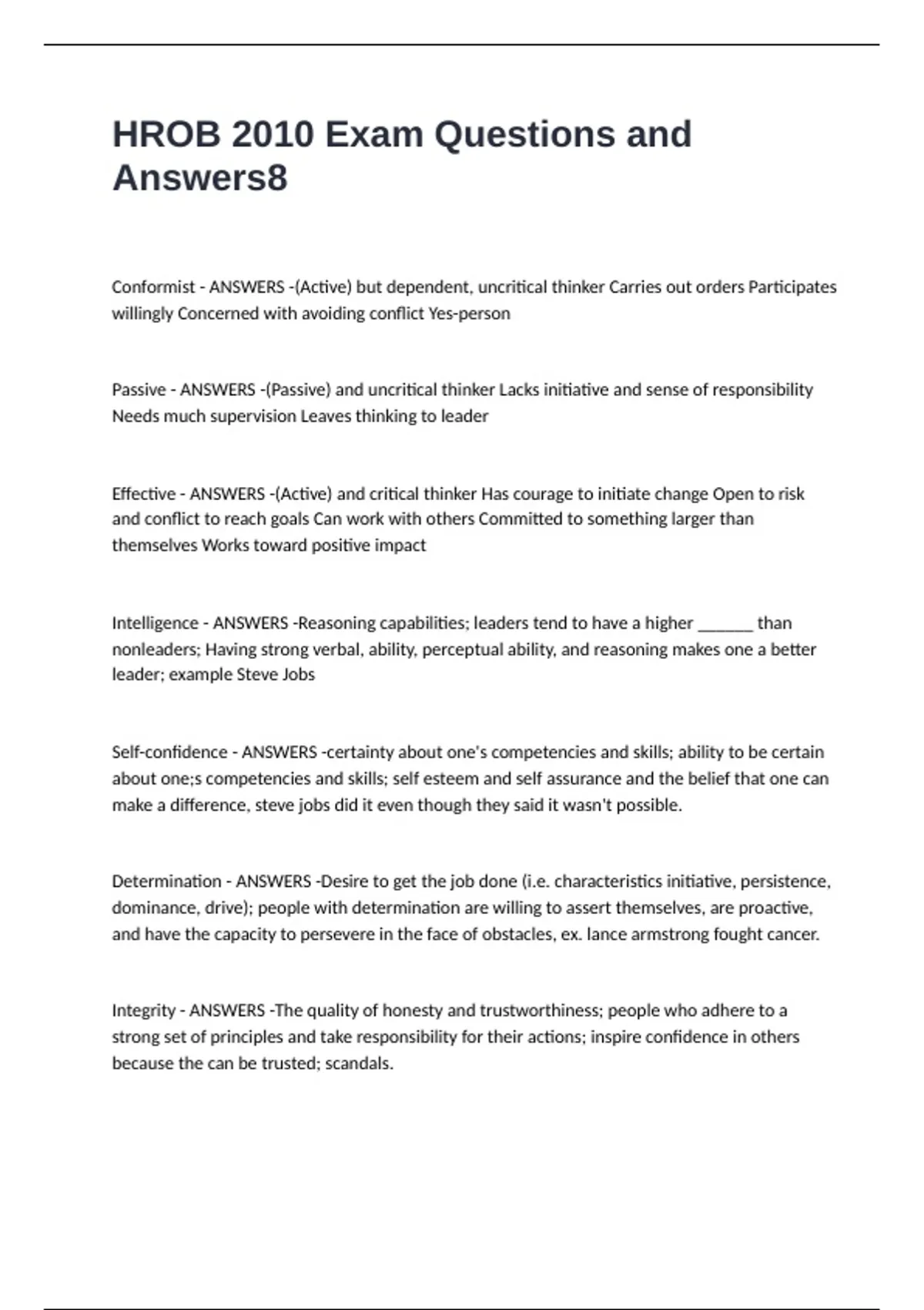HROB 2010 Exam Questions and Answers Conformist - ANSWERS -(Active) but dependent, uncritical thinker Carries out orders Participates willingly Concerned with avoiding conflict Yes-person Passive - ANSWERS -(Passive) and uncritical thinker Lacks initiative and sense of responsibility Needs much supervision Leaves thinking to leader Effective - ANSWERS -(Active) and critical thinker Has courage to initiate change Open to risk and conflict to reach goals Can work with others Committed to something larger than themselves Works toward positive impact Intelligence - ANSWERS -Reasoning capabilities; leaders tend to have a higher ______ than nonleaders; Having strong verbal, ability, perceptual ability, and reasoning makes one a better leader; example Steve Jobs Self-confidence - ANSWERS -certainty about one's competencies and skills; ability to be certain about one;s competencies and skills; self esteem and self assurance and the belief that one can make a difference, steve jobs did it even though they said it wasn't possible. Determination - ANSWERS -Desire to get the job done (i.e. characteristics initiative, persistence, dominance, drive); people with determination are willing to assert themselves, are proactive, and have the capacity to persevere in the face of obstacles, ex. lance armstrong fought cancer. Integrity - ANSWERS -The quality of honesty and trustworthiness; people who adhere to a strong set of principles and take responsibility for their actions; inspire confidence in others because the can be trusted; scandals.