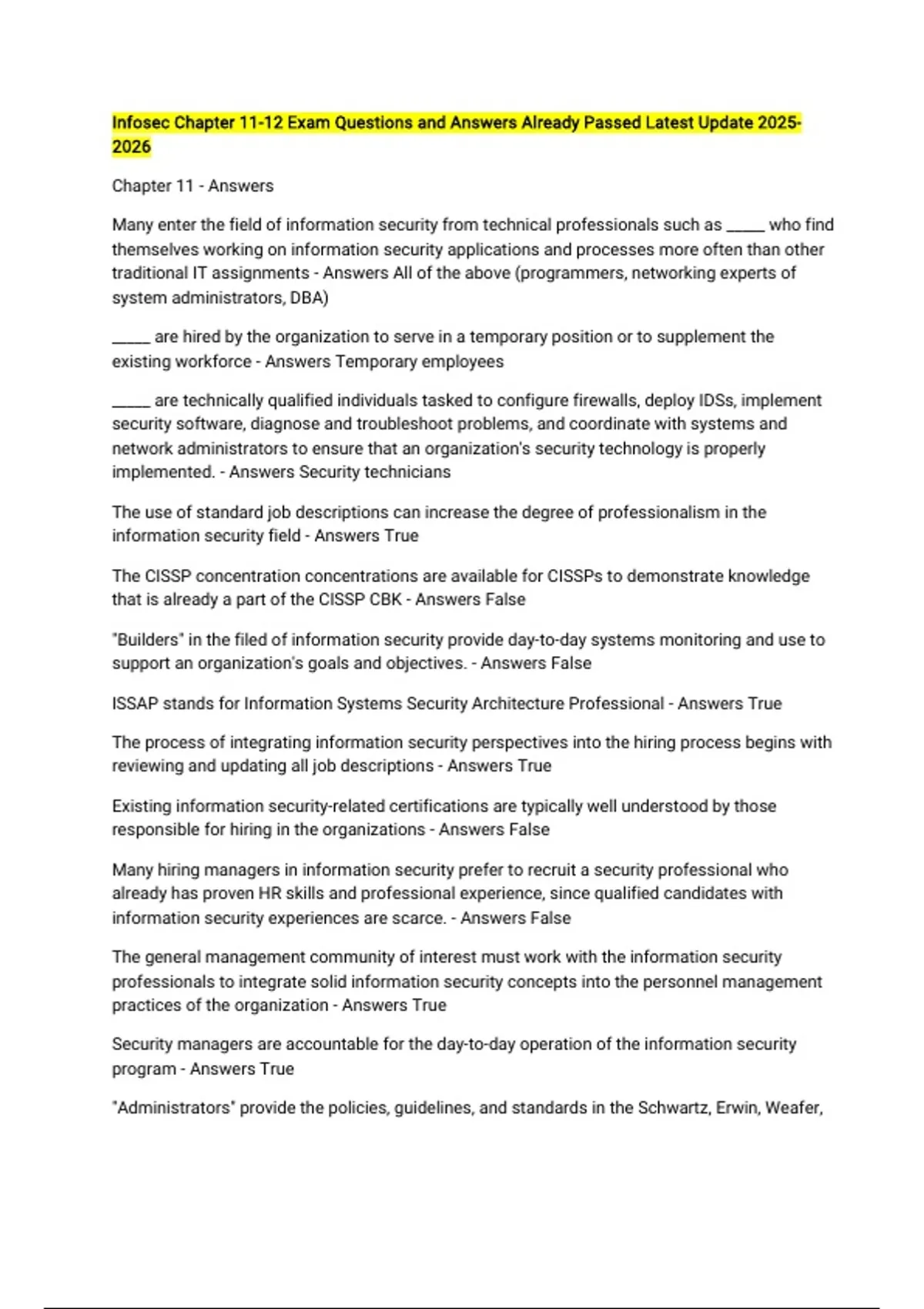 Infosec Chapter 11-12 Exam Questions and Answers Already Passed Latest Update Chapter 11 - Answers Many enter the field of information security from technical professionals such as _____ who find themselves working on information security applications and processes more often than other traditional IT assignments - Answers All of the above (programmers, networking experts of system administrators, DBA) _____ are hired by the organization to serve in a temporary position or to supplement the existing workforce - Answers Temporary employees _____ are technically qualified individuals tasked to configure firewalls, deploy IDSs, implement security software, diagnose and troubleshoot problems, and coordinate with systems and network administrators to ensure that an organization's security technology is properly implemented. - Answers Security technicians The use of standard job descriptions can increase the degree of professionalism in the information security field - Answers True The CISSP concentration concentrations are available for CISSPs to demonstrate knowledge that is already a part of the CISSP CBK - Answers False "Builders" in the filed of information security provide day-to-day systems monitoring and use to support an organization's goals and objectives. - Answers False ISSAP stands for Information Systems Security Architecture Professional - Answers True The process of integrating information security perspectives into the hiring process begins with reviewing and updating all job descriptions - Answers True Existing information security-related certifications are typically well understood by those responsible for hiring in the organizations - Answers False Many hiring managers in information security prefer to recruit a security professional who already has proven HR skills and professional experience, since qualified candidates with information security experiences are scarce. - Answers False The general management community of interest must work with the information security professionals to integrate solid information security concepts into the personnel management practices of the organization - Answers True Security managers are accountable for the day-to-day operation of the information security program - Answers True "Administrators" provide the policies, guidelines, and standards in the Schwartz, Erwin, Weafer, and Briney classification - Answers True The information security functions can be places within the _____ - Answers All of the above (legal department, insurance and risk management function, administrative services function) GIAC stands for Global Information Architecture Certification - Answers False The CISA credential is touted by ISACA as the certification that is appropriate for all but which type of professionals? - Answers Accounting Which of the following is not one of the categories of positions as defined by Schwartz, Erwin, Weafer, and Briney - Answers User In recent years, the _____ certification program has added a set of concentration exams - Answers CISSP ISSMP stands for Information Systems Security Monitoring Professional - Answers False A mandatory furlough provides the organizations with the ability to audit the work of an individual - Answers False Like the CISSP, the SSCP certification is more applicable to the security _____ than to the security _____ - Answers Manager, technician The ISSMP examination is designed to provide CISSPs with a mechanism to demonstrate competence in _____ - Answers All of the above (business continuity planning and disaster recovery planning, enterprise security management practices, security management practices) System Administration, Networking, and Security Organization is better known as _____ - Answers SANS Organizations are not required by law to protect employee information that is sensitive or personal - Answers False ISACA touts the CISA certification as being appropriate for accounting, networking and security professionals - Answers False The organization should integrate the security awareness education into a new hire's ongoing job orientation and make it a part of every employee's on-the-job security training - Answers True _____ is a cornerstone in the protection of information assets and in the prevention of financial loss - Answers Separation of duties To maintain a secure facility, all contract employees should be escorted from room to room, as well as into and out of the facility - Answers True