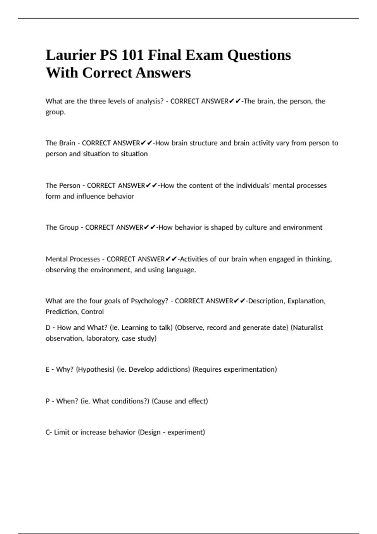 Laurier PS 101 Final Exam Questions With Correct Answers