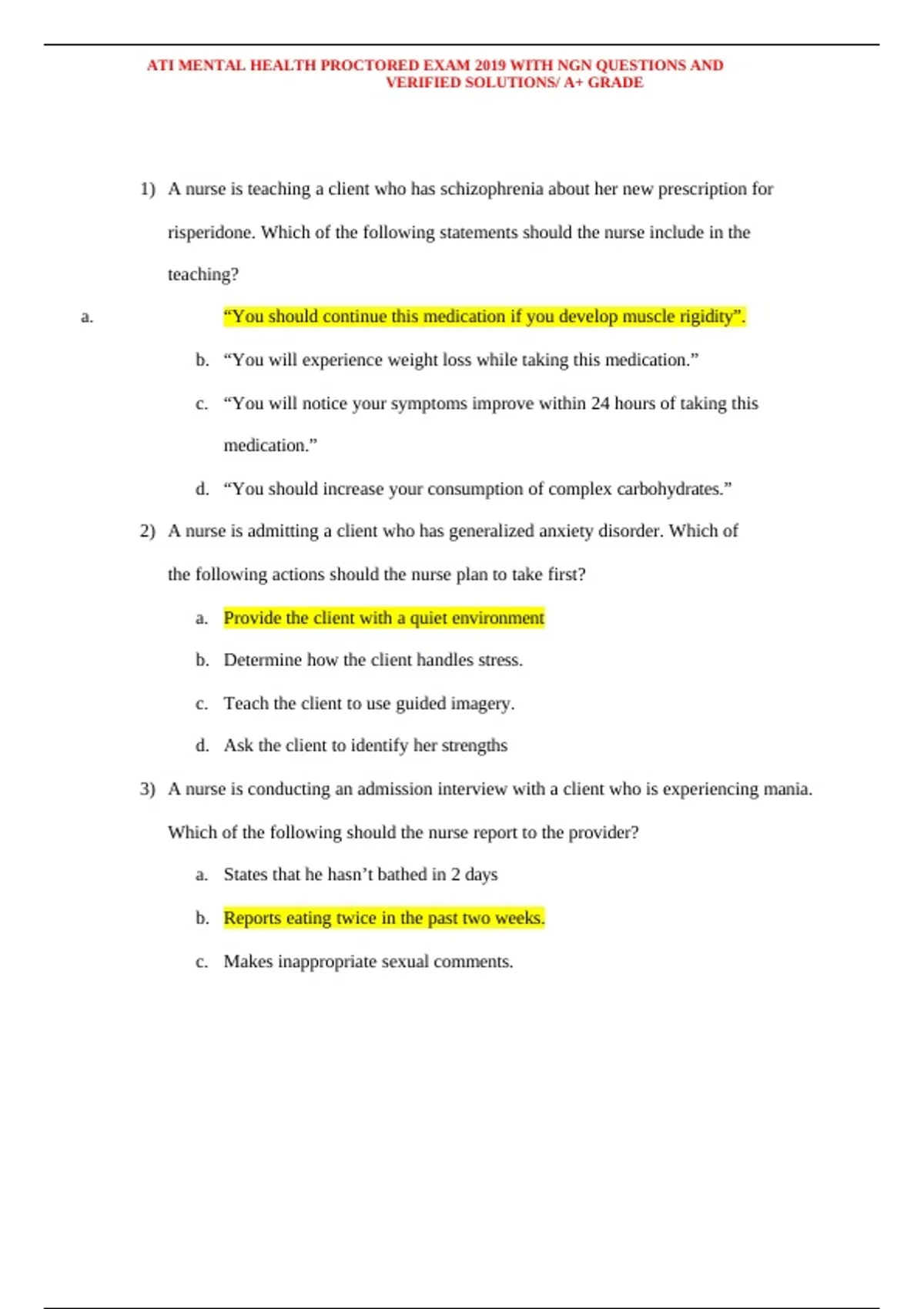 , ATI MENTAL HEALTH PROCTORED EXAM 2019 WITH NGN QUESTIONS AND