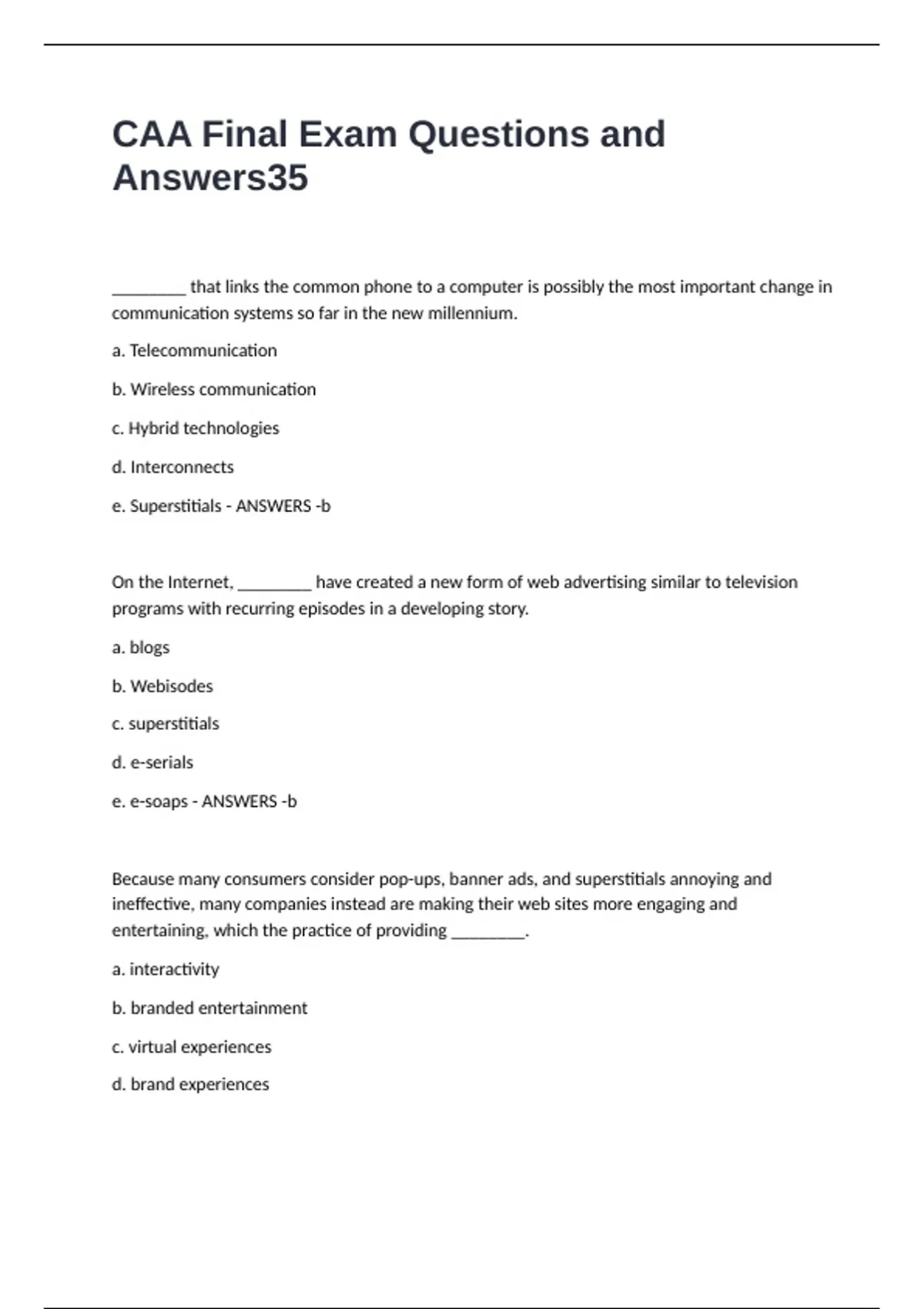 CAA Final Exam Questions and Answers ________ that links the common phone to a computer is possibly the most important change in communication systems so far in the new millennium. a. Telecommunication b. Wireless communication c. Hybrid technologies d. Interconnects e. Superstitials - ANSWERS -b On the Internet, ________ have created a new form of web advertising similar to television programs with recurring episodes in a developing story. a. blogs b. Webisodes c. superstitials d. e-serials e. e-soaps - ANSWERS -b Because many consumers consider pop-ups, banner ads, and superstitials annoying and ineffective, many companies instead are making their web sites more engaging and entertaining, which the practice of providing ________. a. interactivity b. branded entertainment c. virtual experiences d. brand experiences e. situational ads - ANSWERS -d