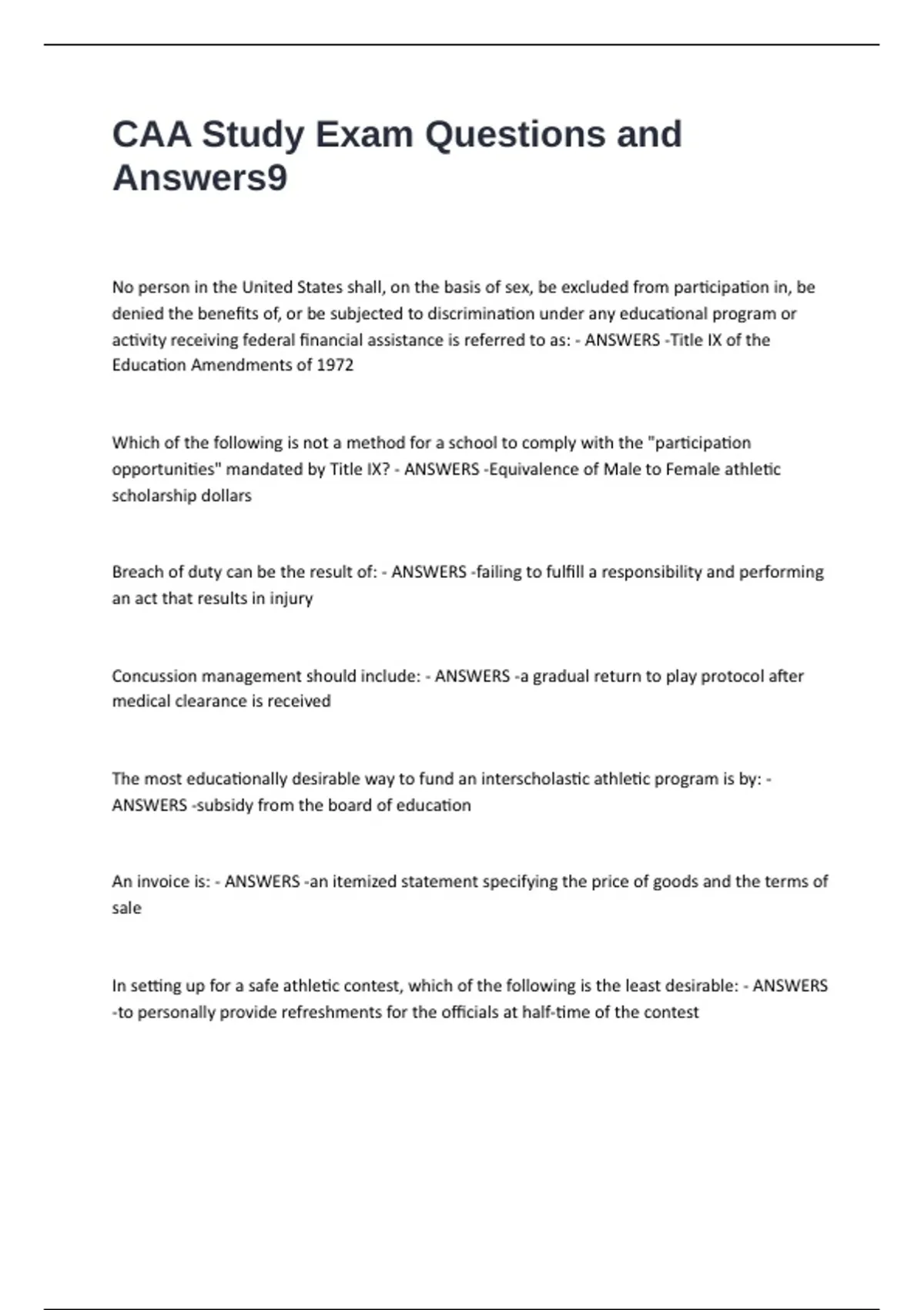 CAA Study Exam Questions and Answers No person in the United States shall, on the basis of sex, be excluded from participation in, be denied the benefits of, or be subjected to discrimination under any educational program or activity receiving federal financial assistance is referred to as: - ANSWERS -Title IX of the Education Amendments of 1972 Which of the following is not a method for a school to comply with the "participation opportunities" mandated by Title IX? - ANSWERS -Equivalence of Male to Female athletic scholarship dollars Breach of duty can be the result of: - ANSWERS -failing to fulfill a responsibility and performing an act that results in injury Concussion management should include: - ANSWERS -a gradual return to play protocol after medical clearance is received The most educationally desirable way to fund an interscholastic athletic program is by: - ANSWERS -subsidy from the board of education An invoice is: - ANSWERS -an itemized statement specifying the price of goods and the terms of sale In setting up for a safe athletic contest, which of the following is the least desirable: - ANSWERS -to personally provide refreshments for the officials at half-time of the contest