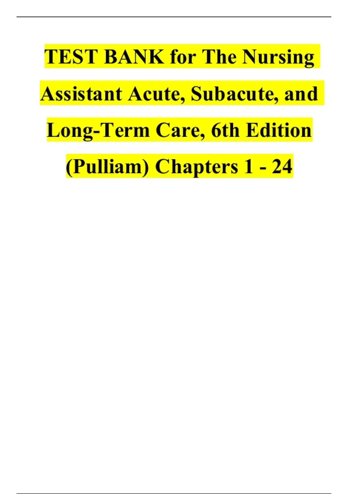 , Test Bank - The Nursing Assistant: Acute, Subacute, and Long-Term Care, 6e (Pulliam, 2020)