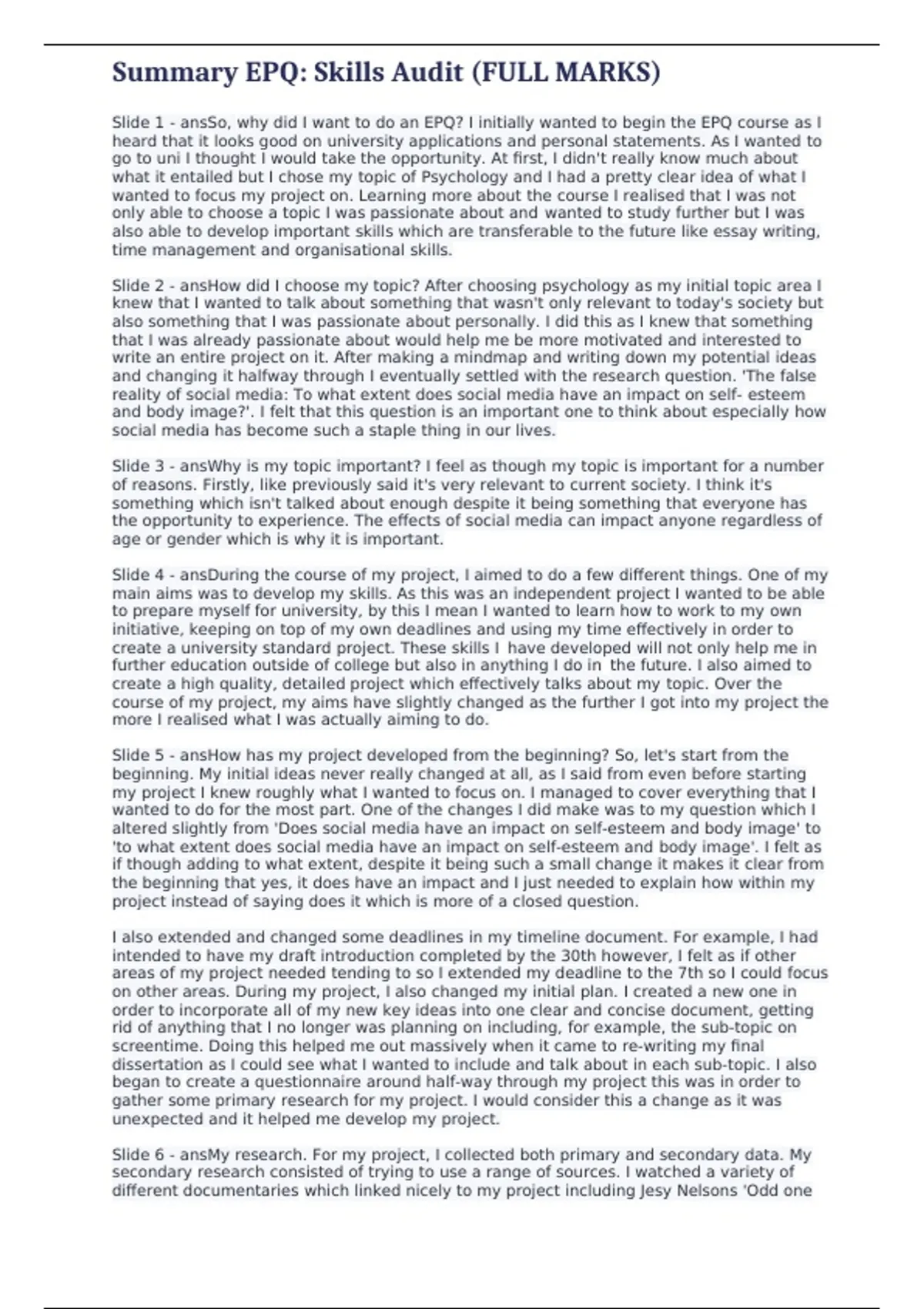 , Summary EPQ: Skills Audit (FULL MARKS)