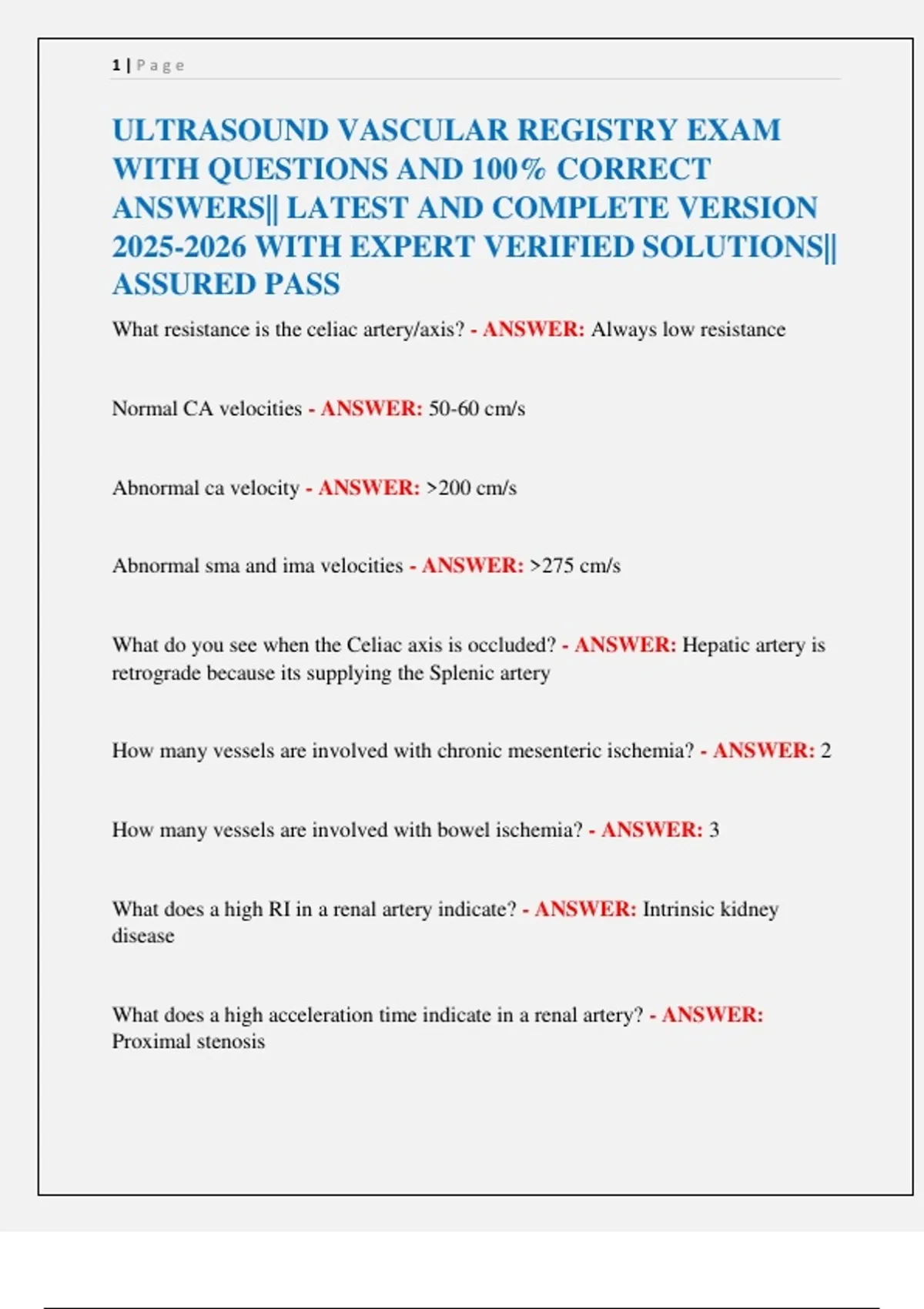 ULTRASOUND VASCULAR REGISTRY EXAM WITH QUESTIONS AND 100% CORRECT ANSWERS|| LATEST AND COMPLETE VERSION WITH EXPERT VERIFIED SOLUTIONS|| ASSURED PASS