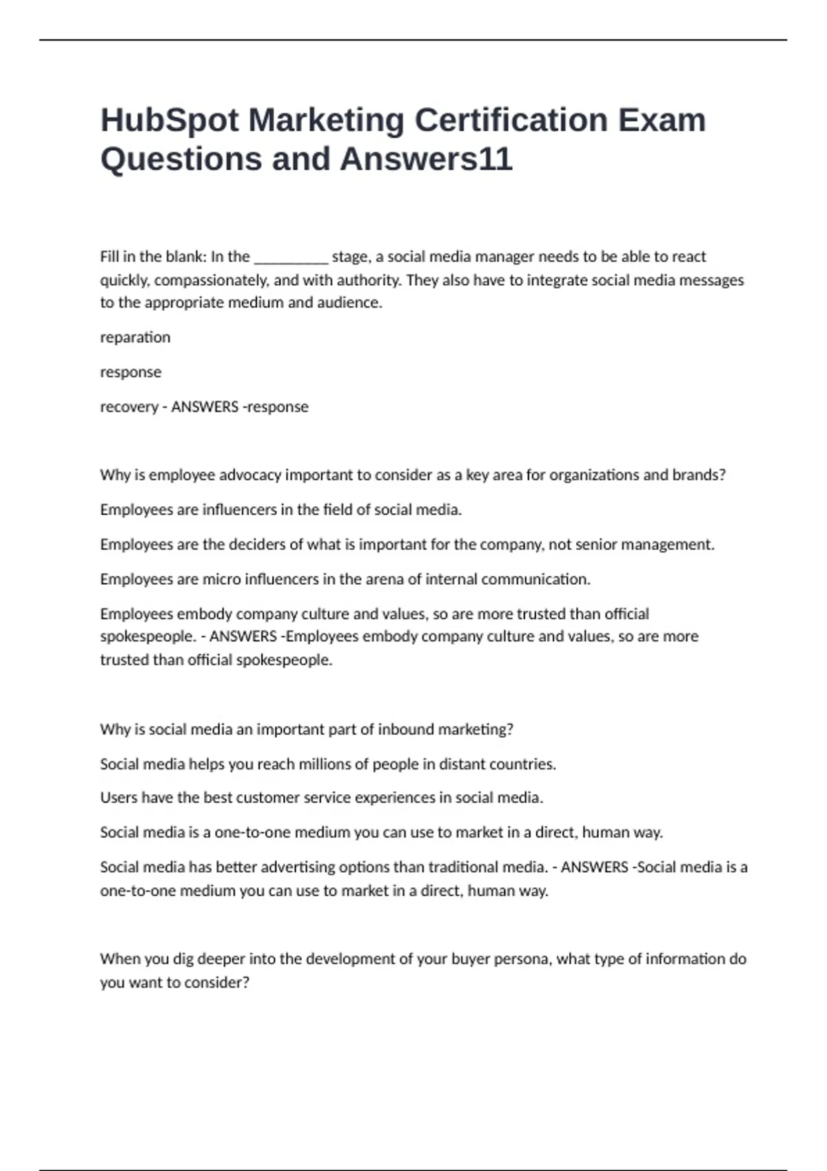 HubSpot Marketing Certification Exam Questions and Answers Fill in the blank: In the _________ stage, a social media manager needs to be able to react quickly, compassionately, and with authority. They also have to integrate social media messages to the appropriate medium and audience. reparation response recovery - ANSWERS -response Why is employee advocacy important to consider as a key area for organizations and brands? Employees are influencers in the field of social media. Employees are the deciders of what is important for the company, not senior management. Employees are micro influencers in the arena of internal communication. Employees embody company culture and values, so are more trusted than official spokespeople. - ANSWERS -Employees embody company culture and values, so are more trusted than official spokespeople. Why is social media an important part of inbound marketing? Social media helps you reach millions of people in distant countries. Users have the best customer service experiences in social media. Social media is a one-to-one medium you can use to market in a direct, human way. Social media has better advertising options than traditional media. - ANSWERS -Social media is a one-to-one medium you can use to market in a direct, human way. When you dig deeper into the development of your buyer persona, what type of information do you want to consider?
