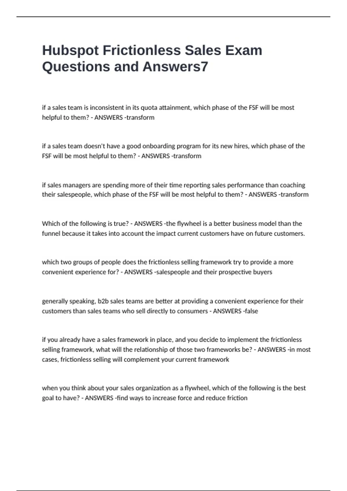 Hubspot Frictionless Sales Exam Questions and Answers if a sales team is inconsistent in its quota attainment, which phase of the FSF will be most helpful to them? - ANSWERS -transform if a sales team doesn't have a good onboarding program for its new hires, which phase of the FSF will be most helpful to them? - ANSWERS -transform if sales managers are spending more of their time reporting sales performance than coaching their salespeople, which phase of the FSF will be most helpful to them? - ANSWERS -transform Which of the following is true? - ANSWERS -the flywheel is a better business model than the funnel because it takes into account the impact current customers have on future customers. which two groups of people does the frictionless selling framework try to provide a more convenient experience for? - ANSWERS -salespeople and their prospective buyers generally speaking, b2b sales teams are better at providing a convenient experience for their customers than sales teams who sell directly to consumers - ANSWERS -false if you already have a sales framework in place, and you decide to implement the frictionless selling framework, what will the relationship of those two frameworks be? - ANSWERS -in most cases, frictionless selling will complement your current framework when you think about your sales organization as a flywheel, which of the following is the best goal to have? - ANSWERS -find ways to increase force and reduce friction