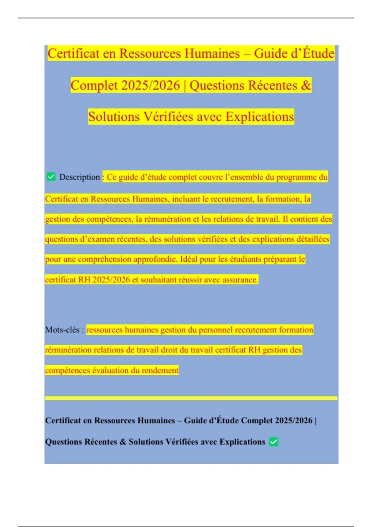 Certificat en Ressources Humaines – Guide d’Étude Complet 2025/2026 | Questions Récentes & Solutions Vérifiées avec Explications Description : Ce guide d’étude complet couvre l’ensemble du programme du Certificat en Ressources Humaines, incluant le recrutement, la formation, la gestion des compétences, la rémunération et les relations de travail. Il contient des questions d’examen récentes, des solutions vérifiées et des explications détaillées pour une compréhension approfondie. Idéal pour les étudiants préparant le certificat RH 2025/2026 et souhaitant réussir avec assurance. Mots-clés : ressources humaines gestion du personnel recrutement formation rémunération relations de travail droit du travail certificat RH gestion des compétences évaluation du rendement