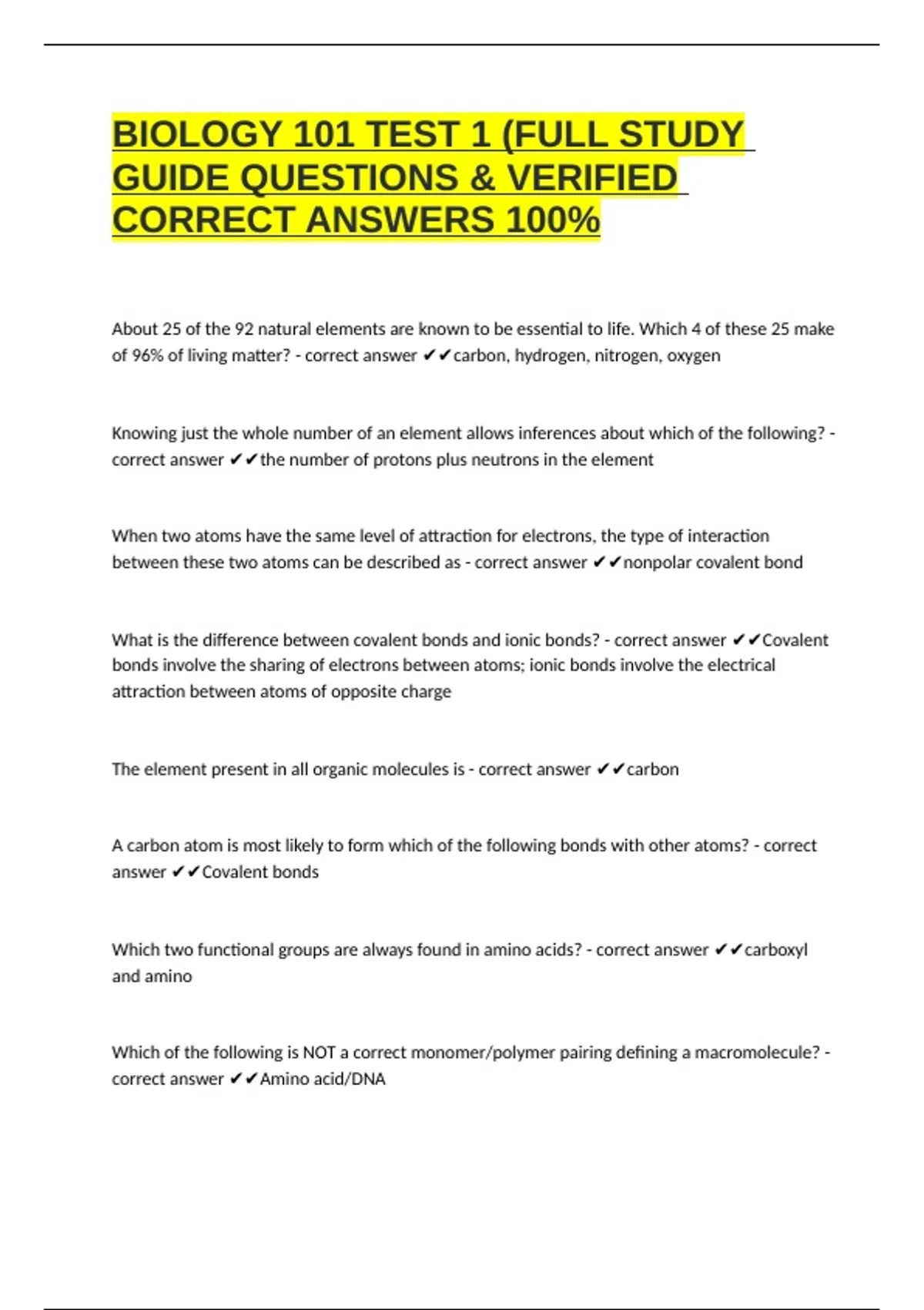 BIOLOGY 101 TEST 1 (FULL STUDY GUIDE QUESTIONS & VERIFIED CORRECT ANSWERS 100% helps students review and memorize key concepts typically covered in an introductory General Biology (BIO 101) course
