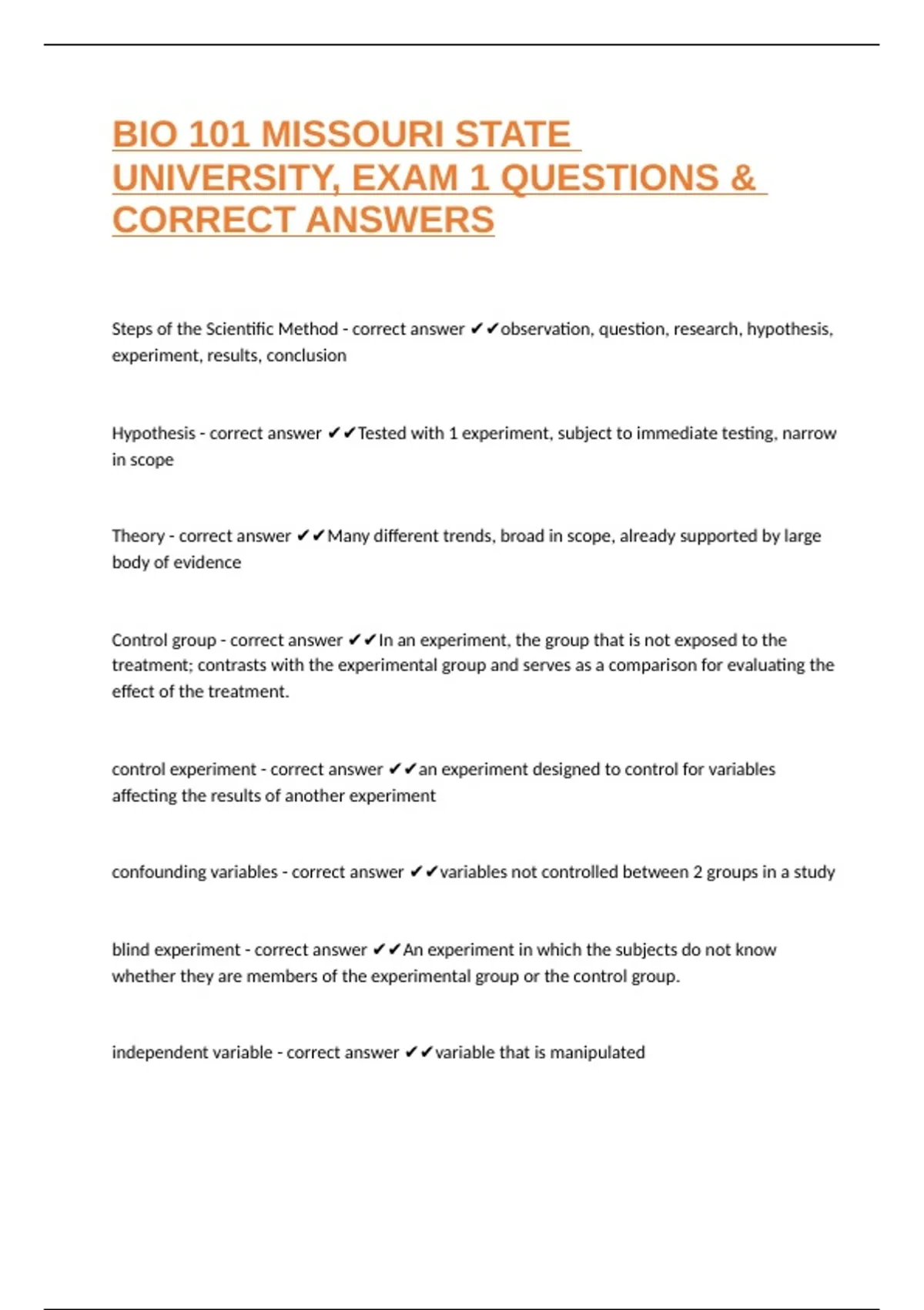 BIO 101 MISSOURI STATE UNIVERSITY, EXAM 1 QUESTIONS & CORRECT ANSWERS often made by students or instructors and include flashcards, practice questions, and matching games focused on the main topics of the exam.