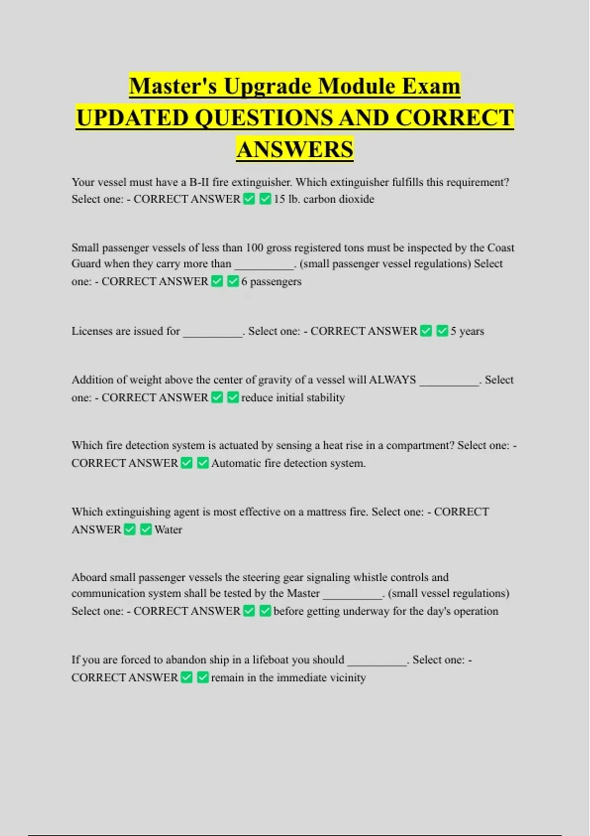 Master's Upgrade Module Exam UPDATED QUESTIONS AND CORRECT ANSWERS Your vessel must have a B-II fire extinguisher. Which extinguisher fulfills this requirement? Select one: - CORRECT ANSWER 15 lb. carbon dioxide Small passenger vessels of less than 100 gross registered tons must be inspected by the Coast Guard when they carry more than __________. (small passenger vessel regulations) Select one: - CORRECT ANSWER 6 passengers Licenses are issued for __________. Select one: - CORRECT ANSWER 5 years Addition of weight above the center of gravity of a vessel will ALWAYS __________. Select one: - CORRECT ANSWER reduce initial stability Which fire detection system is actuated by sensing a heat rise in a compartment? Select one: - CORRECT ANSWER Automatic fire detection system. Which extinguishing agent is most effective on a mattress fire. Select one: - CORRECT ANSWER Water Aboard small passenger vessels the steering gear signaling whistle controls and communication system shall be tested by the Master __________. (small vessel regulations) Select one: - CORRECT ANSWER before getting underway for the day's operation