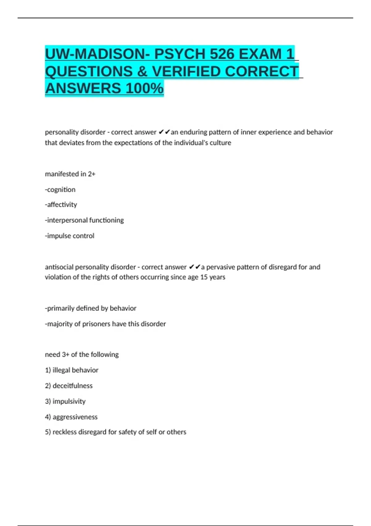 UW-MADISON- PSYCH 526 EXAM 1 QUESTIONS & VERIFIED CORRECT ANSWERS 100% designed to help nursing students review and prepare for exams in NSG 526, a graduate-level nursing course often focused on Advanced Pathophysiology, Advanced Pharmacology, or Advanced Health Assessment, depending on the program.