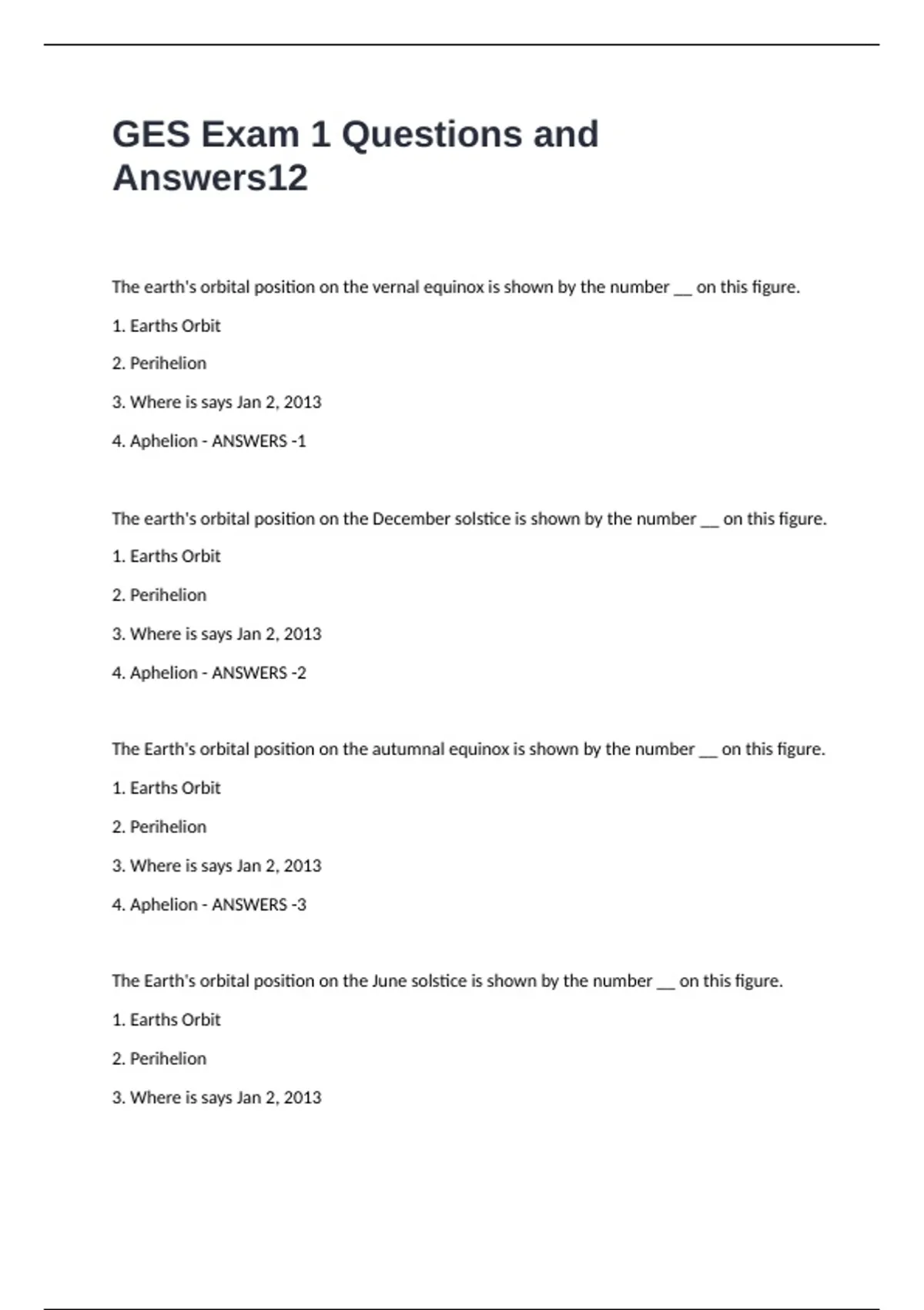 GES Exam 1 Questions and Answers The earth's orbital position on the vernal equinox is shown by the number __ on this figure. 1. Earths Orbit 2. Perihelion 3. Where is says Jan 2, 2013 4. Aphelion - ANSWERS -1 The earth's orbital position on the December solstice is shown by the number __ on this figure. 1. Earths Orbit 2. Perihelion 3. Where is says Jan 2, 2013 4. Aphelion - ANSWERS -2 The Earth's orbital position on the autumnal equinox is shown by the number __ on this figure. 1. Earths Orbit 2. Perihelion 3. Where is says Jan 2, 2013 4. Aphelion - ANSWERS -3 The Earth's orbital position on the June solstice is shown by the number __ on this figure. 1. Earths Orbit 2. Perihelion 3. Where is says Jan 2, 2013 4. Aphelion - ANSWERS -4