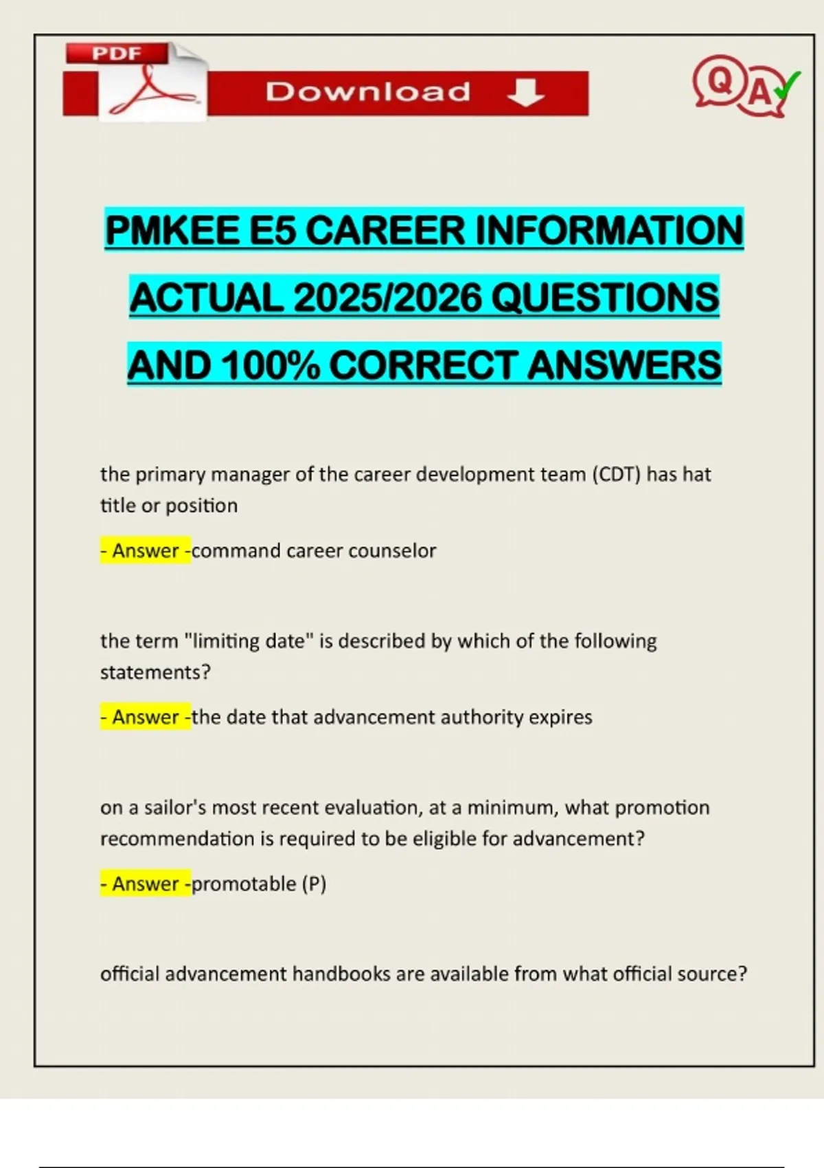 PMKEE E5 CAREER INFORMATION ACTUAL 2025/2026 QUESTIONS AND 100% CORRECT ANSWERS the primary manager of the career development team (CDT) has hat title or position - Answer -command career counselor the term "limiting date" is described by which of the following statements? - Answer -the date that advancement authority expires on a sailor's most recent evaluation, at a minimum, what promotion recommendation is required to be eligible for advancement? - Answer -promotable (P) official advancement handbooks are available from what official source?Need assistance on Online classes, Exams & Assignments? Reach out for instant help!! Full Course Assistance, Plagiarism-free Essay Writing, Research Paper, Dissertation, Discussion Posts, etc…. Confidential & Secure services. Tutors are available for all subjects! Email now at: - Answer -naval education and training professional development and technology center a sailor selected for the sta-21 program is required to attend a university that offers which of the following programs? - Answer -NROTC during a sailor's pcs process, the gaining command should assign