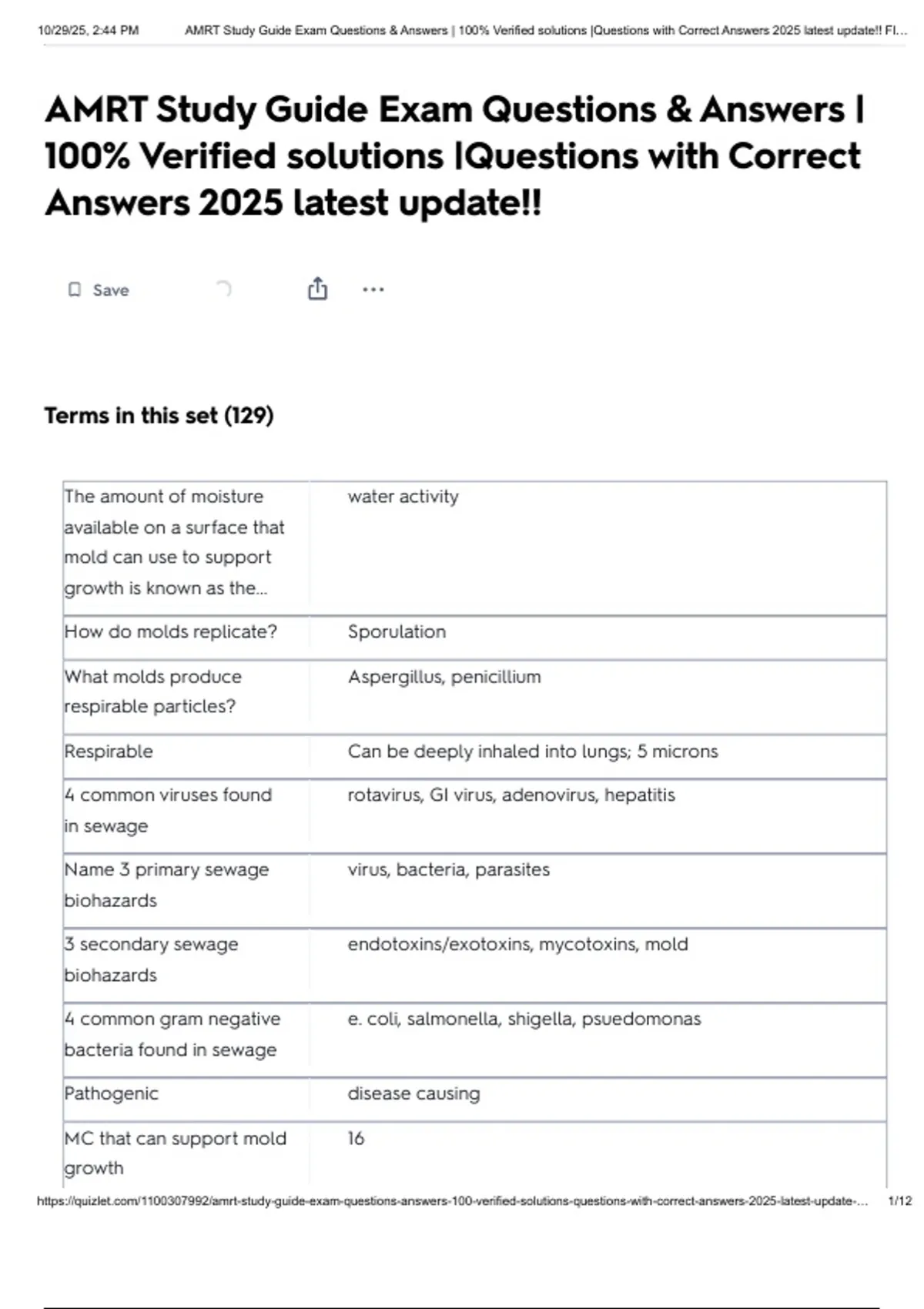, 10/29/25, 2:44 PM AMRT Study Guide Exam Questions & Answers | 100% Verified solutions |Questions with Correct Answers 2025 latest update!! Fl…