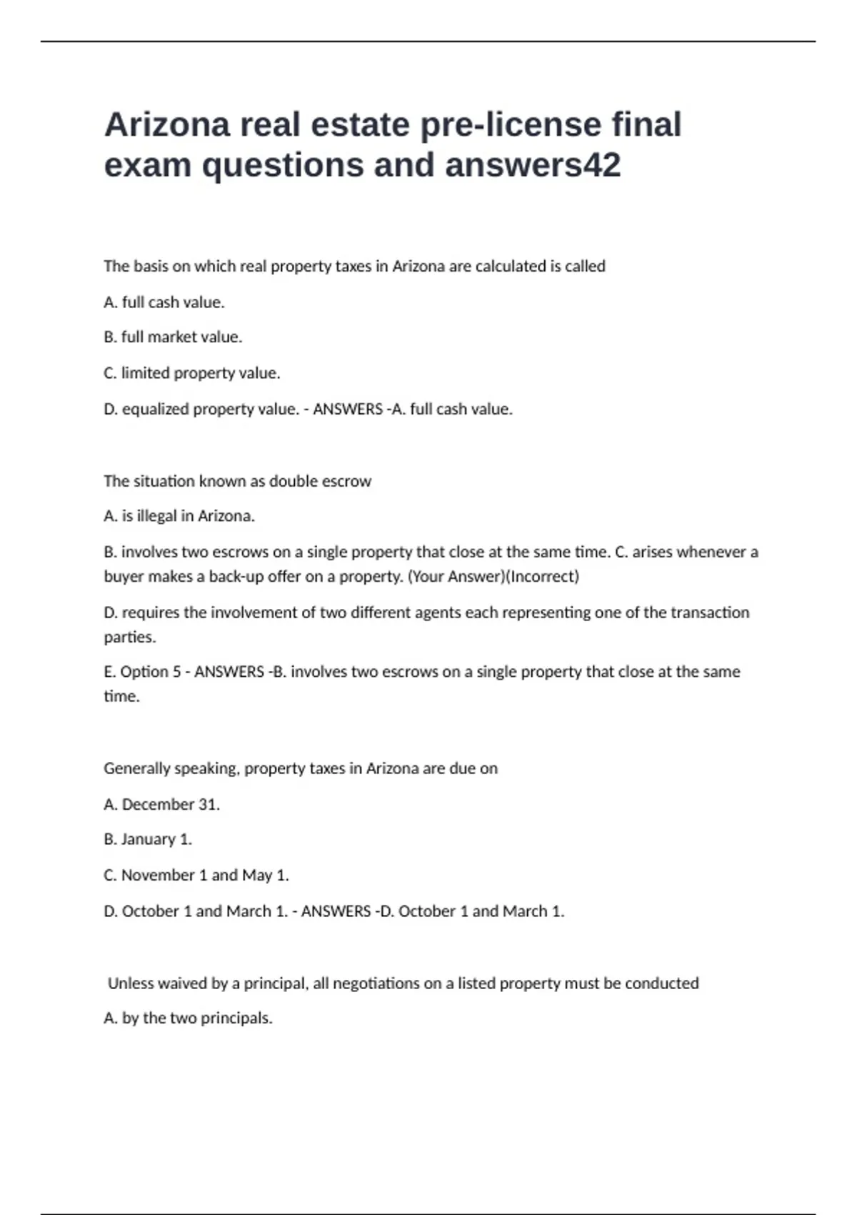 Arizona real estate pre-license final exam questions and answers The basis on which real property taxes in Arizona are calculated is called A. full cash value. B. full market value. C. limited property value. D. equalized property value. - ANSWERS -A. full cash value. The situation known as double escrow A. is illegal in Arizona. B. involves two escrows on a single property that close at the same time. C. arises whenever a buyer makes a back-up offer on a property. (Your Answer)(Incorrect) D. requires the involvement of two different agents each representing one of the transaction parties. E. Option 5 - ANSWERS -B. involves two escrows on a single property that close at the same time. Generally speaking, property taxes in Arizona are due on A. December 31. B. January 1. C. November 1 and May 1. D. October 1 and March 1. - ANSWERS -D. October 1 and March 1. Unless waived by a principal, all negotiations on a listed property must be conducted A. by the two principals.