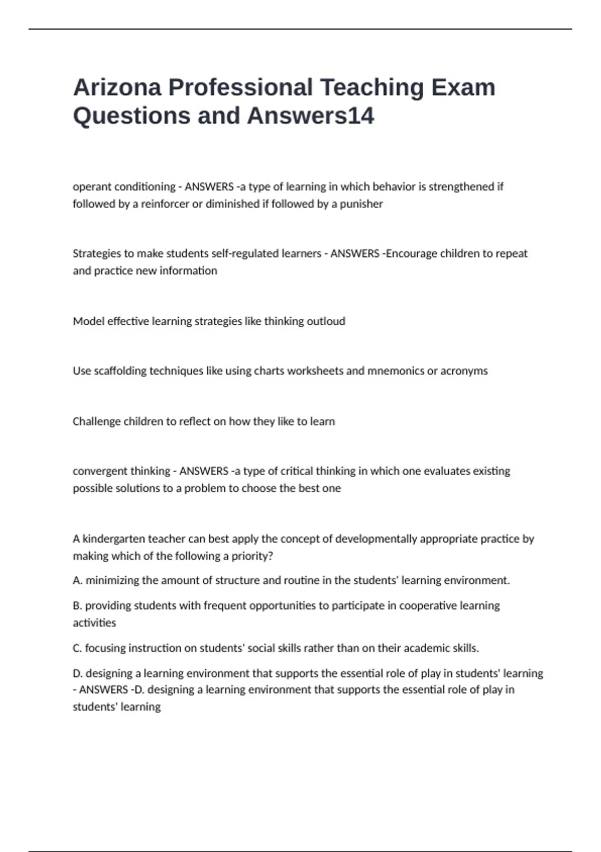 Arizona Professional Teaching Exam Questions and Answers operant conditioning - ANSWERS -a type of learning in which behavior is strengthened if followed by a reinforcer or diminished if followed by a punisher Strategies to make students self-regulated learners - ANSWERS -Encourage children to repeat and practice new information Model effective learning strategies like thinking outloud Use scaffolding techniques like using charts worksheets and mnemonics or acronyms Challenge children to reflect on how they like to learn convergent thinking - ANSWERS -a type of critical thinking in which one evaluates existing possible solutions to a problem to choose the best one A kindergarten teacher can best apply the concept of developmentally appropriate practice by making which of the following a priority? A. minimizing the amount of structure and routine in the students' learning environment. B. providing students with frequent opportunities to participate in cooperative learning activities C. focusing instruction on students' social skills rather than on their academic skills. D. designing a learning environment that supports the essential role of play in students' learning - ANSWERS -D. designing a learning environment that supports the essential role of play in students' learning