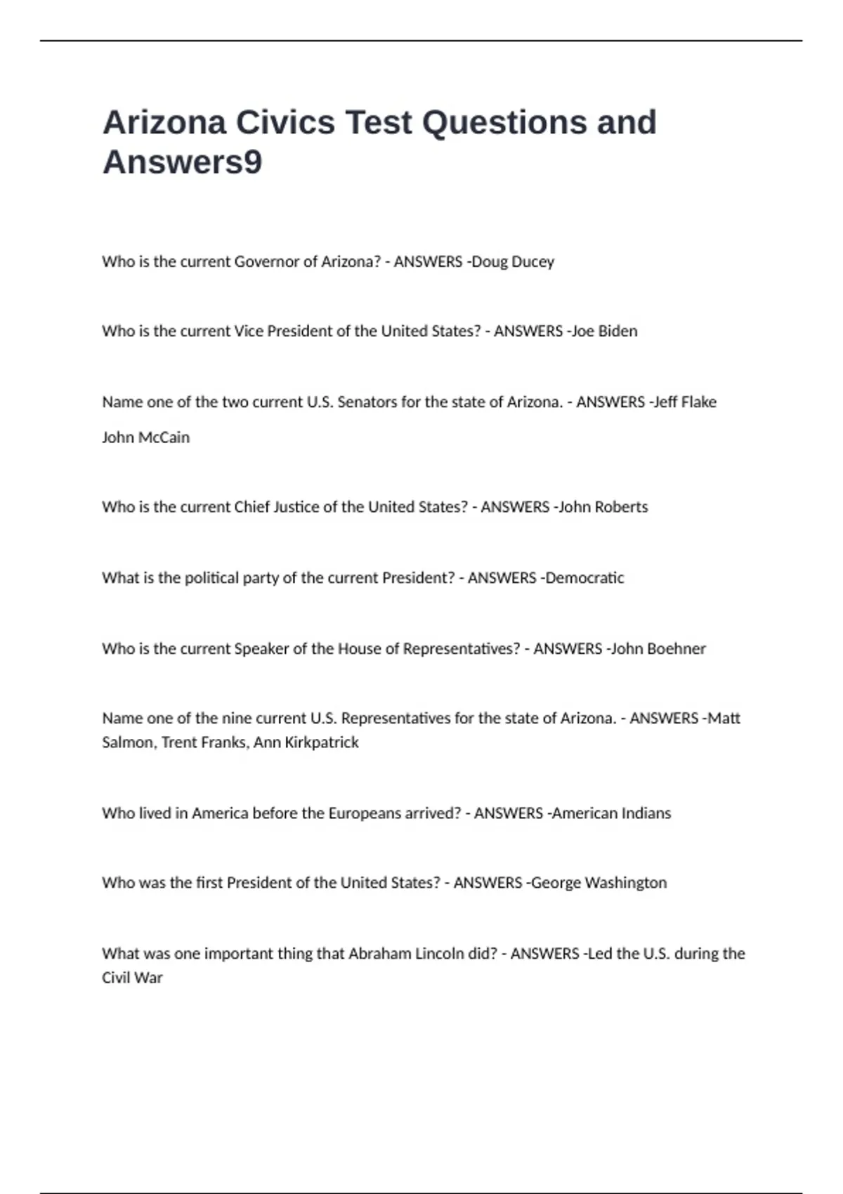 Name one of the two current U.S. Senators for the state of Arizona. - ANSWERS -Jeff Flake