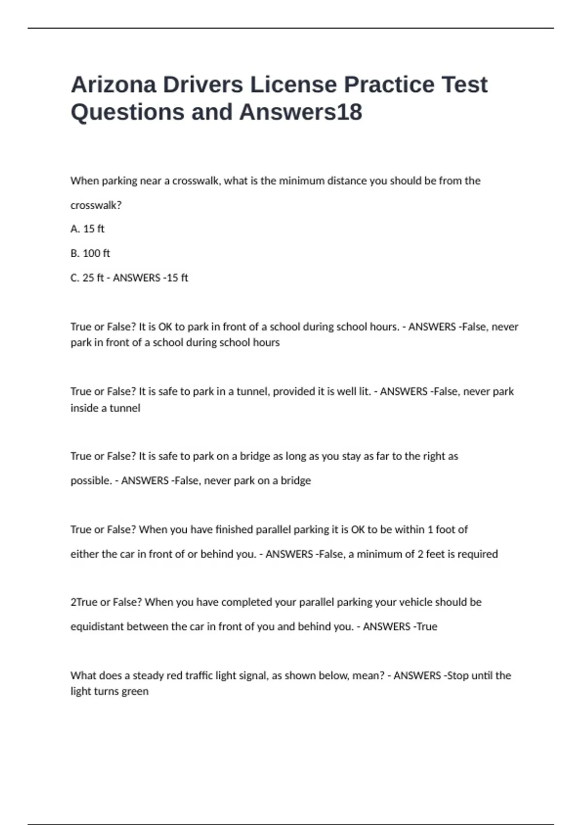 Arizona Drivers License Practice Test Questions and Answers When parking near a crosswalk, what is the minimum distance you should be from the crosswalk? A. 15 ft B. 100 ft C. 25 ft - ANSWERS -15 ft True or False? It is OK to park in front of a school during school hours. - ANSWERS -False, never park in front of a school during school hours True or False? It is safe to park in a tunnel, provided it is well lit. - ANSWERS -False, never park inside a tunnel True or False? It is safe to park on a bridge as long as you stay as far to the right as possible. - ANSWERS -False, never park on a bridge True or False? When you have finished parallel parking it is OK to be within 1 foot of either the car in front of or behind you. - ANSWERS -False, a minimum of 2 feet is required 2True or False? When you have completed your parallel parking your vehicle should be equidistant between the car in front of you and behind you. - ANSWERS -True What does a steady red traffic light signal, as shown below, mean? - ANSWERS -Stop until the light turns green