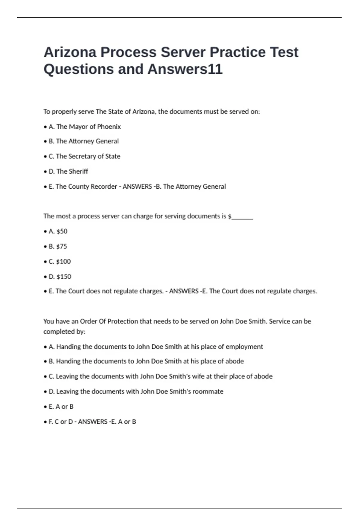 • A. Handing the documents to John Doe Smith at his place of employment