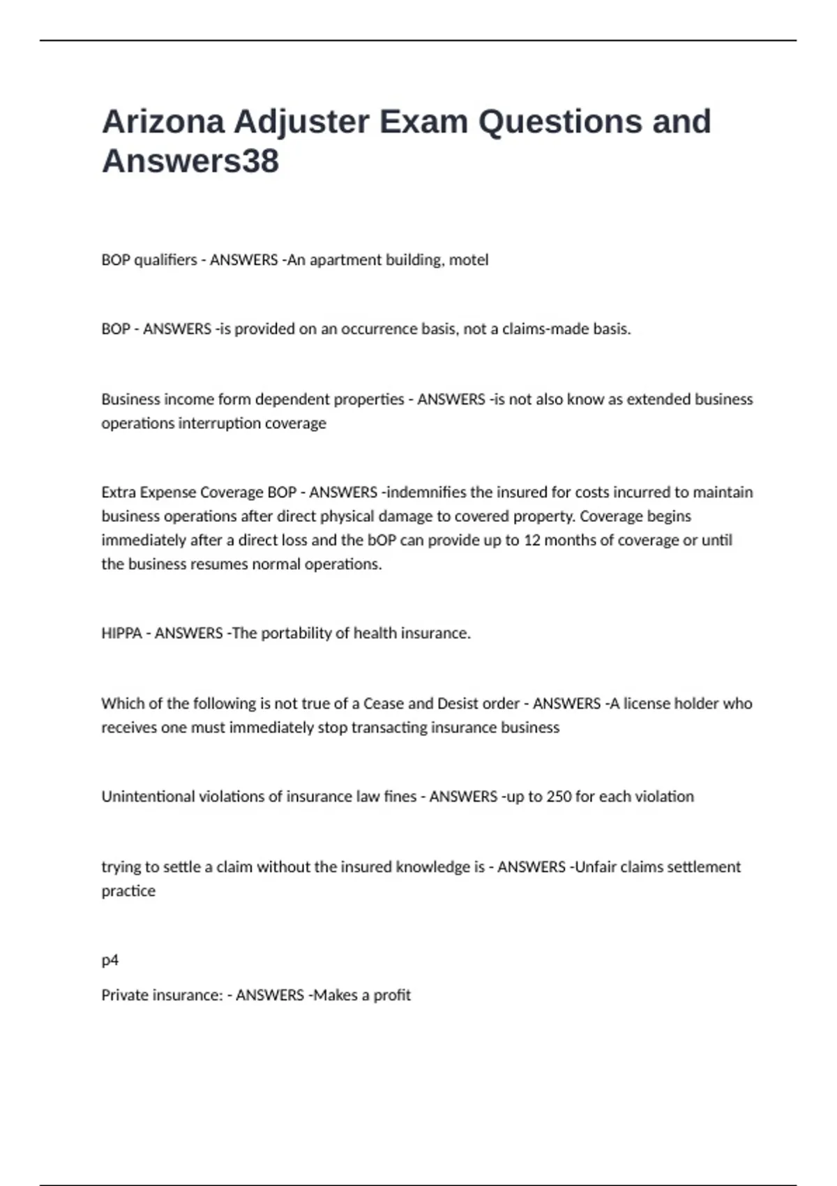 Arizona Adjuster Exam Questions and Answers BOP qualifiers - ANSWERS -An apartment building, motel BOP - ANSWERS -is provided on an occurrence basis, not a claims-made basis. Business income form dependent properties - ANSWERS -is not also know as extended business operations interruption coverage Extra Expense Coverage BOP - ANSWERS -indemnifies the insured for costs incurred to maintain business operations after direct physical damage to covered property. Coverage begins immediately after a direct loss and the bOP can provide up to 12 months of coverage or until the business resumes normal operations. HIPPA - ANSWERS -The portability of health insurance. Which of the following is not true of a Cease and Desist order - ANSWERS -A license holder who receives one must immediately stop transacting insurance business Unintentional violations of insurance law fines - ANSWERS -up to 250 for each violation trying to settle a claim without the insured knowledge is - ANSWERS -Unfair claims settlement practice p4 Private insurance: - ANSWERS -Makes a profit