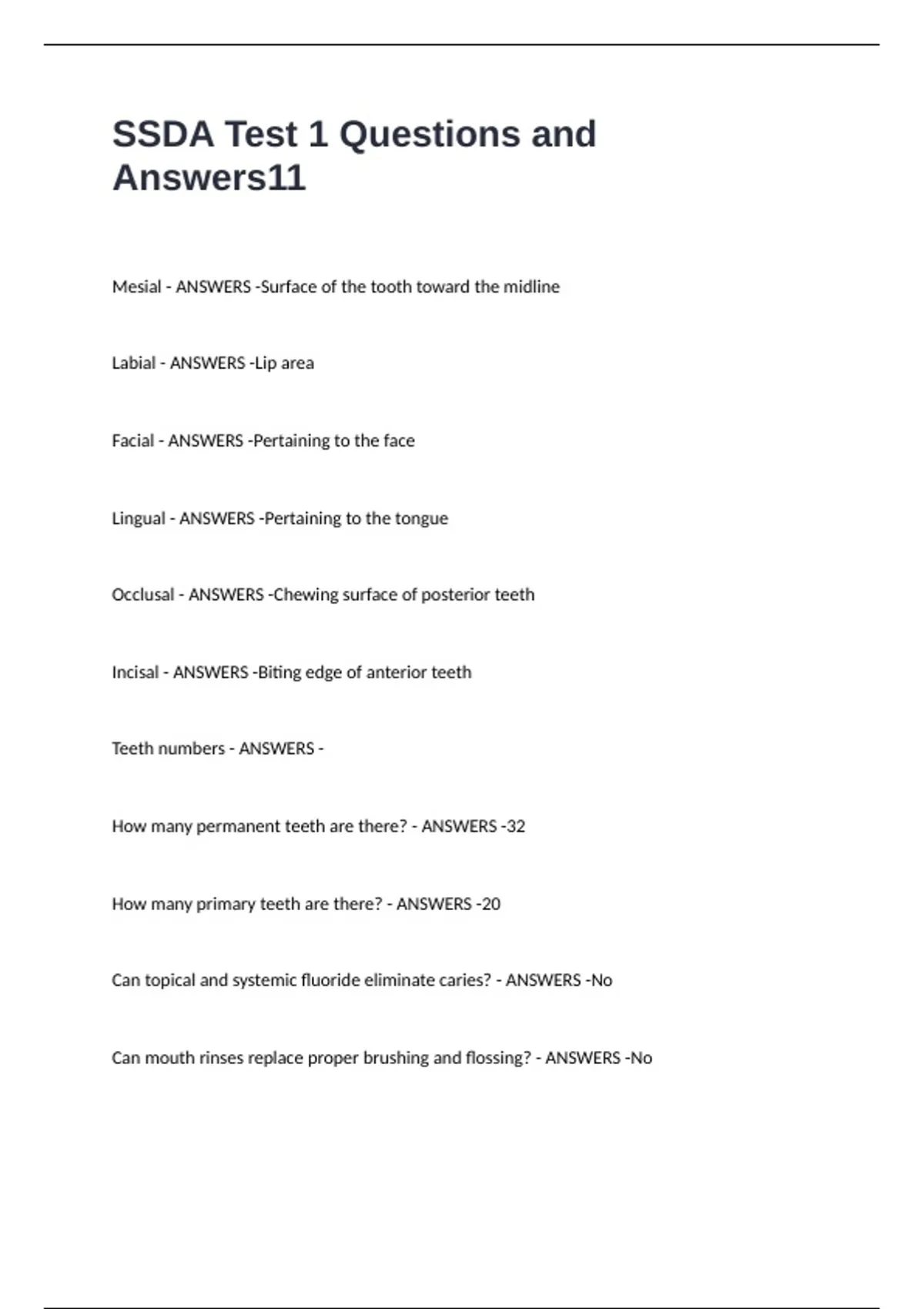 SSDA Test 1 Questions and Answers Mesial - ANSWERS -Surface of the tooth toward the midline Labial - ANSWERS -Lip area Facial - ANSWERS -Pertaining to the face Lingual - ANSWERS -Pertaining to the tongue Occlusal - ANSWERS -Chewing surface of posterior teeth Incisal - ANSWERS -Biting edge of anterior teeth Teeth numbers - ANSWERS - How many permanent teeth are there? - ANSWERS -32 How many primary teeth are there? - ANSWERS -20 Can topical and systemic fluoride eliminate caries? - ANSWERS -No Can mouth rinses replace proper brushing and flossing? - ANSWERS -No Optimal levels for systemic fluoride? - ANSWERS -0.7-1.2 ppm