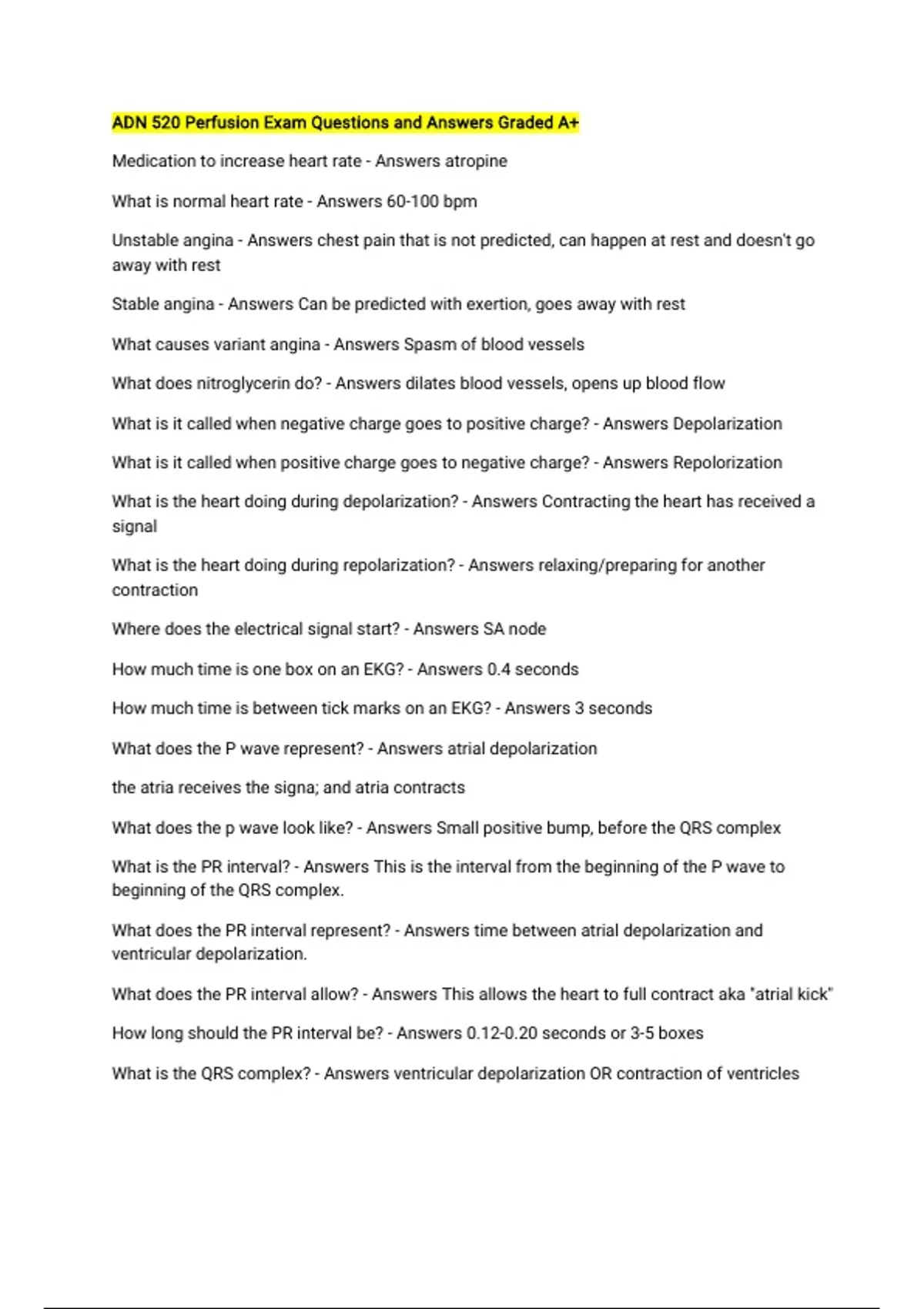 ADN 520 Perfusion Exam Questions and Answers Graded A+ Medication to increase heart rate - Answers atropine What is normal heart rate - Answers 60-100 bpm Unstable angina - Answers chest pain that is not predicted, can happen at rest and doesn't go away with rest Stable angina - Answers Can be predicted with exertion, goes away with rest What causes variant angina - Answers Spasm of blood vessels What does nitroglycerin do? - Answers dilates blood vessels, opens up blood flow What is it called when negative charge goes to positive charge? - Answers Depolarization What is it called when positive charge goes to negative charge? - Answers Repolorization What is the heart doing during depolarization? - Answers Contracting the heart has received a signal What is the heart doing during repolarization? - Answers relaxing/preparing for another contraction Where does the electrical signal start? - Answers SA node How much time is one box on an EKG? - Answers 0.4 seconds How much time is between tick marks on an EKG? - Answers 3 seconds What does the P wave represent? - Answers atrial depolarization the atria receives the signa; and atria contracts What does the p wave look like? - Answers Small positive bump, before the QRS complex What is the PR interval? - Answers This is the interval from the beginning of the P wave to beginning of the QRS complex. What does the PR interval represent? - Answers time between atrial depolarization and ventricular depolarization. What does the PR interval allow? - Answers This allows the heart to full contract aka "atrial kick" How long should the PR interval be? - Answers 0.12-0.20 seconds or 3-5 boxes What is the QRS complex? - Answers ventricular depolarization OR contraction of ventricles What does the QRS look like? - Answers Largest point in EKG