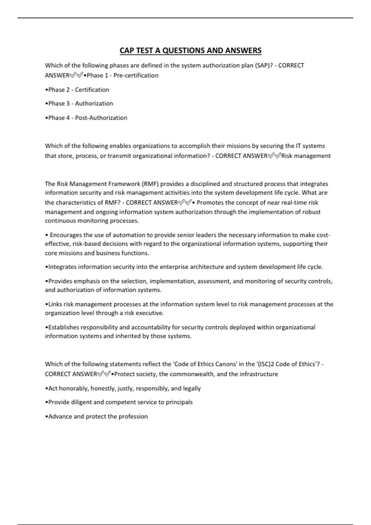 CAP TEST A QUESTIONS AND ANSWERS Which of the following phases are defined in the system authorization plan (SAP)? - CORRECT ANSWER•Phase 1 - Pre-certification •Phase 2 - Certification •Phase 3 - Authorization •Phase 4 - Post-Authorization