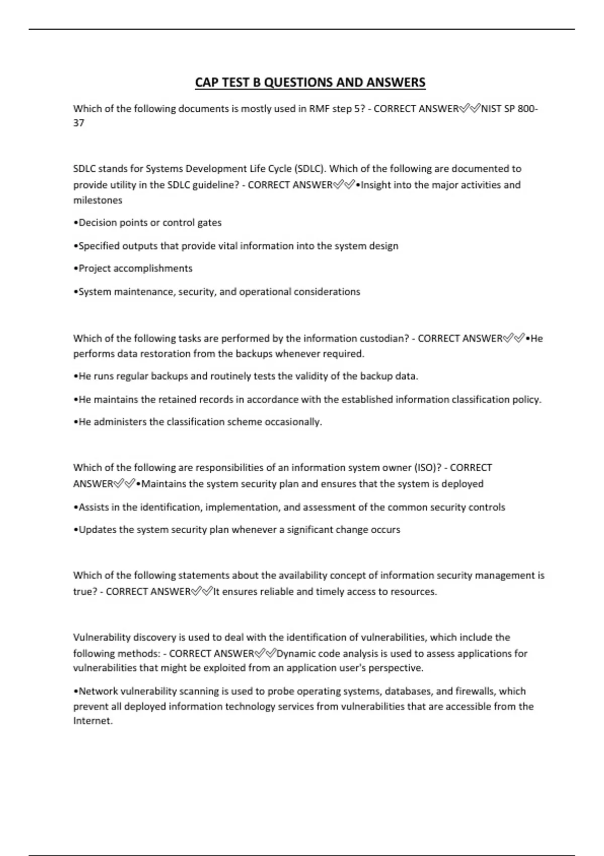 CAP TEST B QUESTIONS AND ANSWERS Which of the following documents is mostly used in RMF step 5? - CORRECT ANSWERNIST SP 800 37 SDLC stands for Systems Development Life Cycle (SDLC). Which of the following are documented to provide utility in the SDLC guideline? - CORRECT ANSWER•Insight into the major activities and milestones •Decision points or control gates •Specified outputs that provide vital information into the system design •Project accomplishments •System maintenance, security, and operational considerations