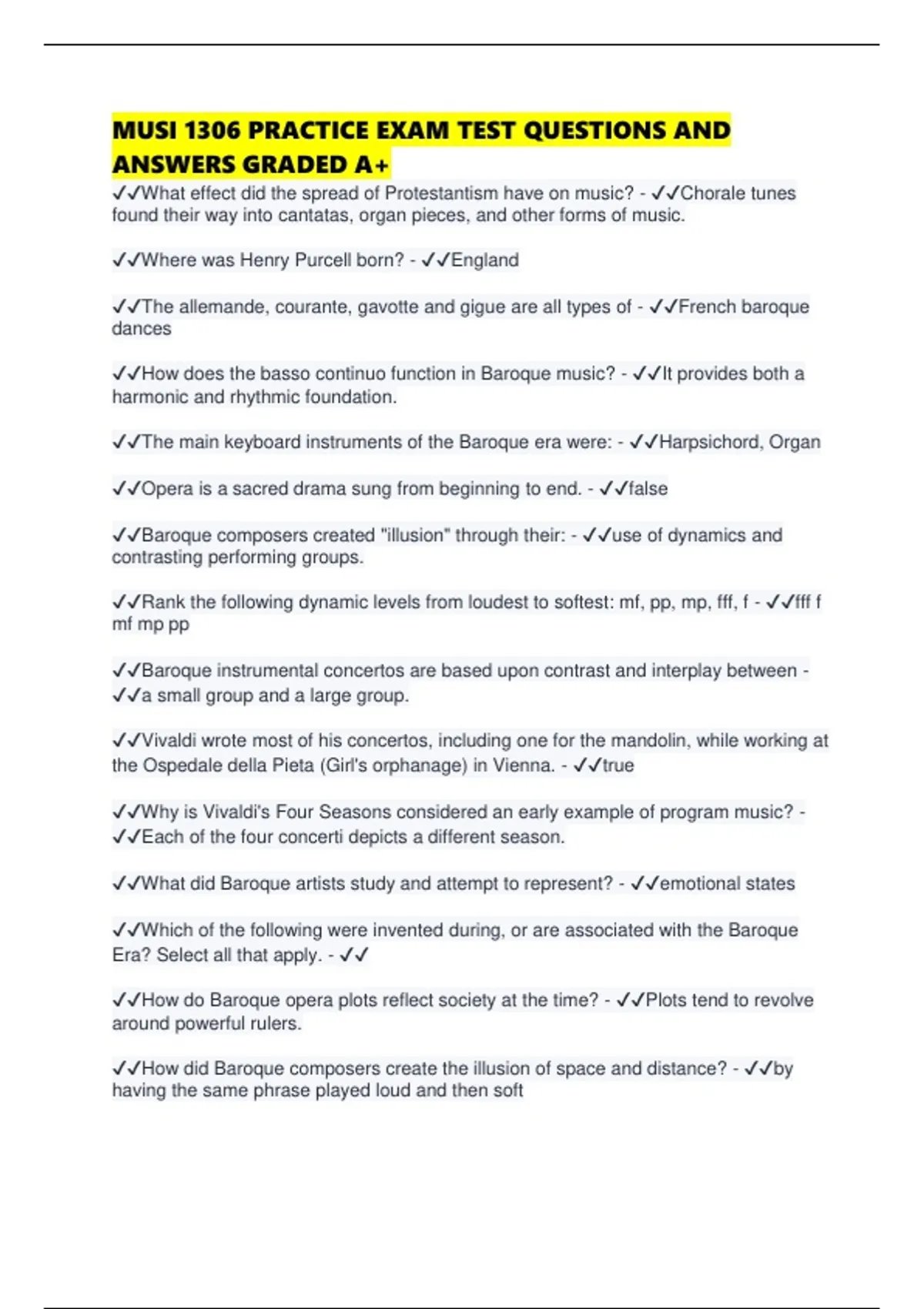 MUSI 1306 PRACTICE EXAM TEST QUESTIONS AND ANSWERS GRADED A+