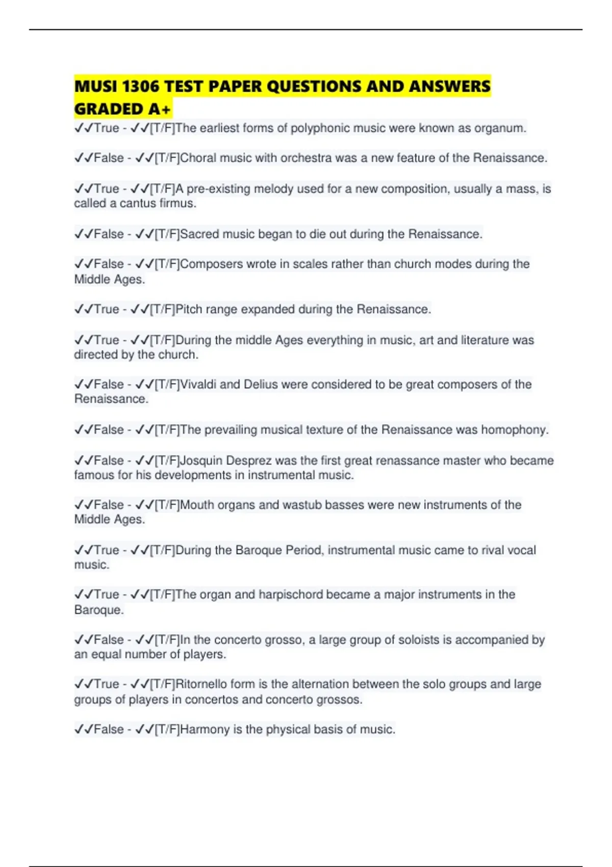 MUSI 1306 TEST PAPER QUESTIONS AND ANSWERS GRADED A+