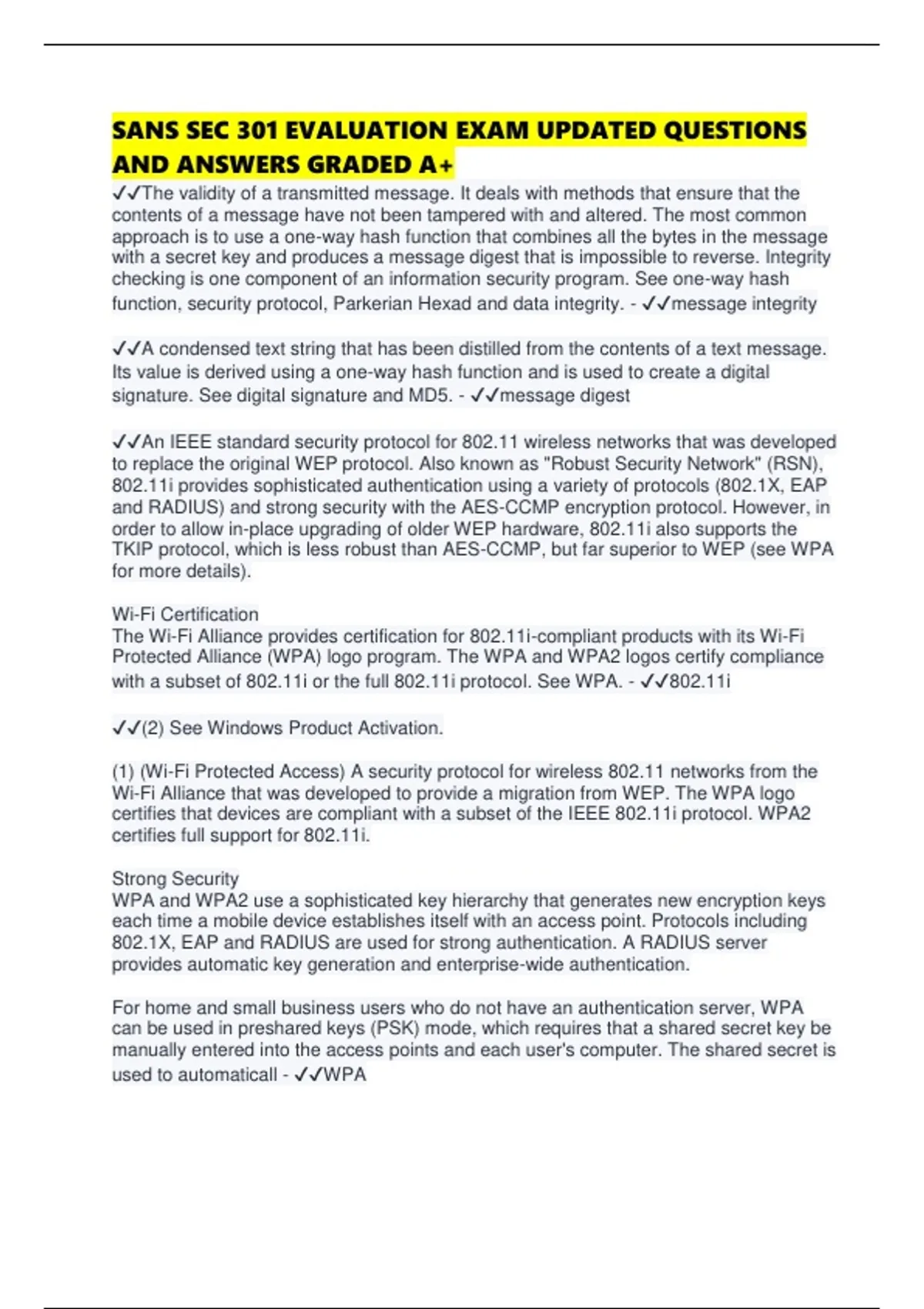 SANS SEC 301 EVALUATION EXAM UPDATED QUESTIONS AND ANSWERS GRADED A+