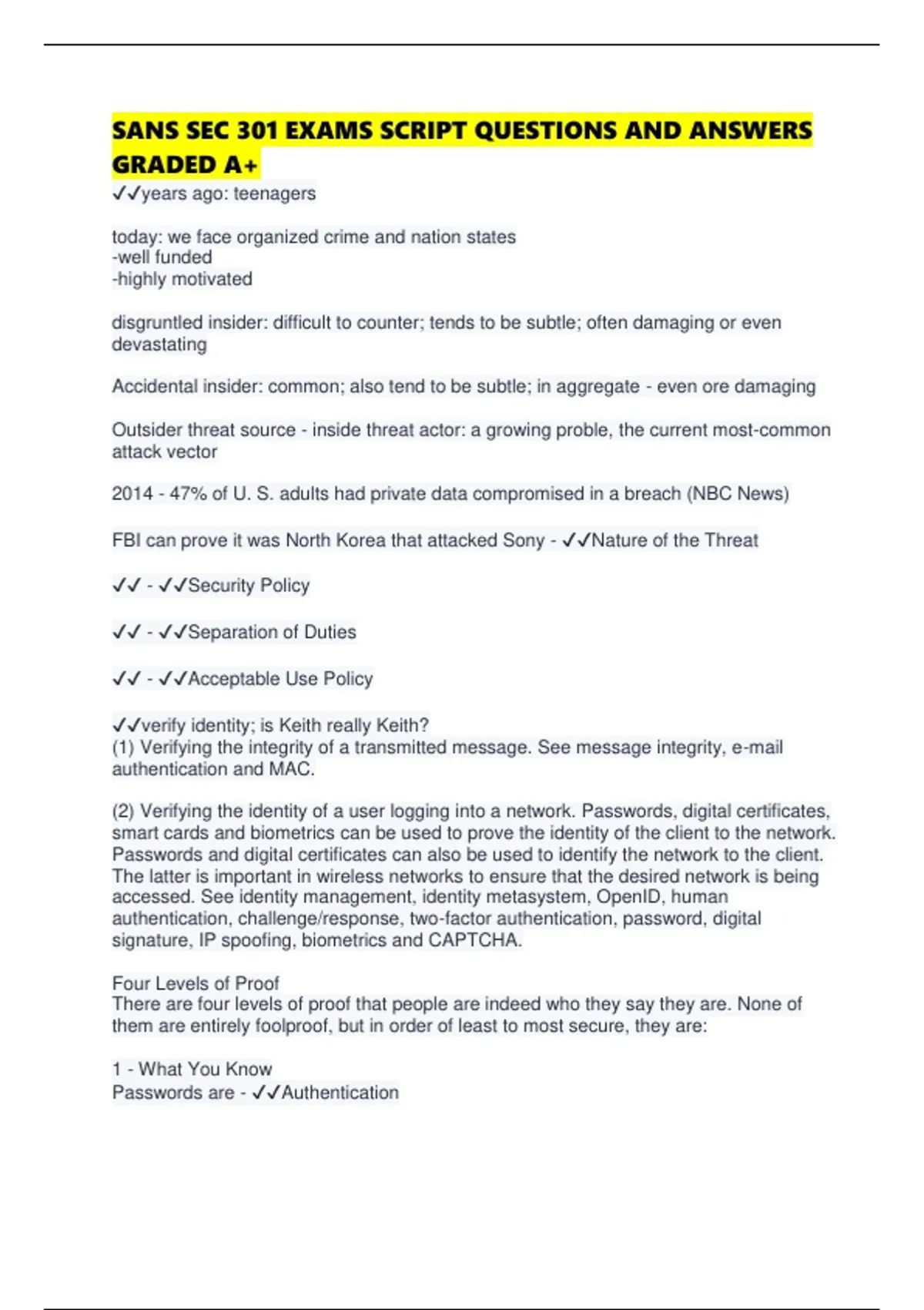 SANS SEC 301 EXAMS SCRIPT QUESTIONS AND ANSWERS GRADED A+