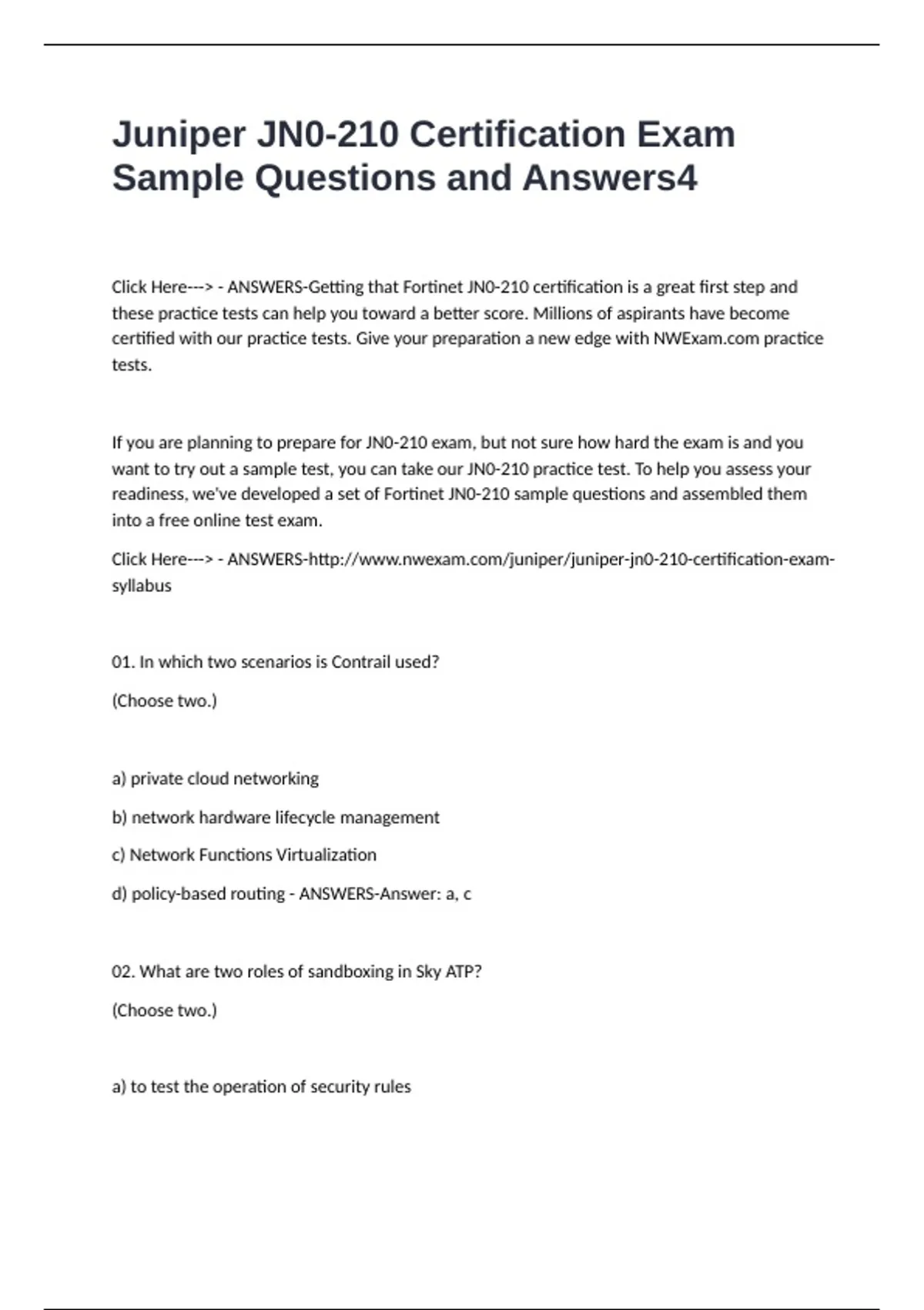 Juniper JN0-210 Certification Exam Sample Questions and Answers Click Here---> - ANSWERS-Getting that Fortinet JN0-210 certification is a great first step and these practice tests can help you toward a better score. Millions of aspirants have become certified with our practice tests. Give your preparation a new edge with NWE practice tests. If you are planning to prepare for JN0-210 exam, but not sure how hard the exam is and you want to try out a sample test, you can take our JN0-210 practice test. To help you assess your readiness, we've developed a set of Fortinet JN0-210 sample questions and assembled them into a free online test exam. Click Here---> - ANSWERS- 01. In which two scenarios is Contrail used? (Choose two.) a) private cloud networking b) network hardware lifecycle management c) Network Functions Virtualization d) policy-based routing - ANSWERS-Answer: a, c 02. What are two roles of sandboxing in Sky ATP? (Choose two.) a) to test the operation of security rules