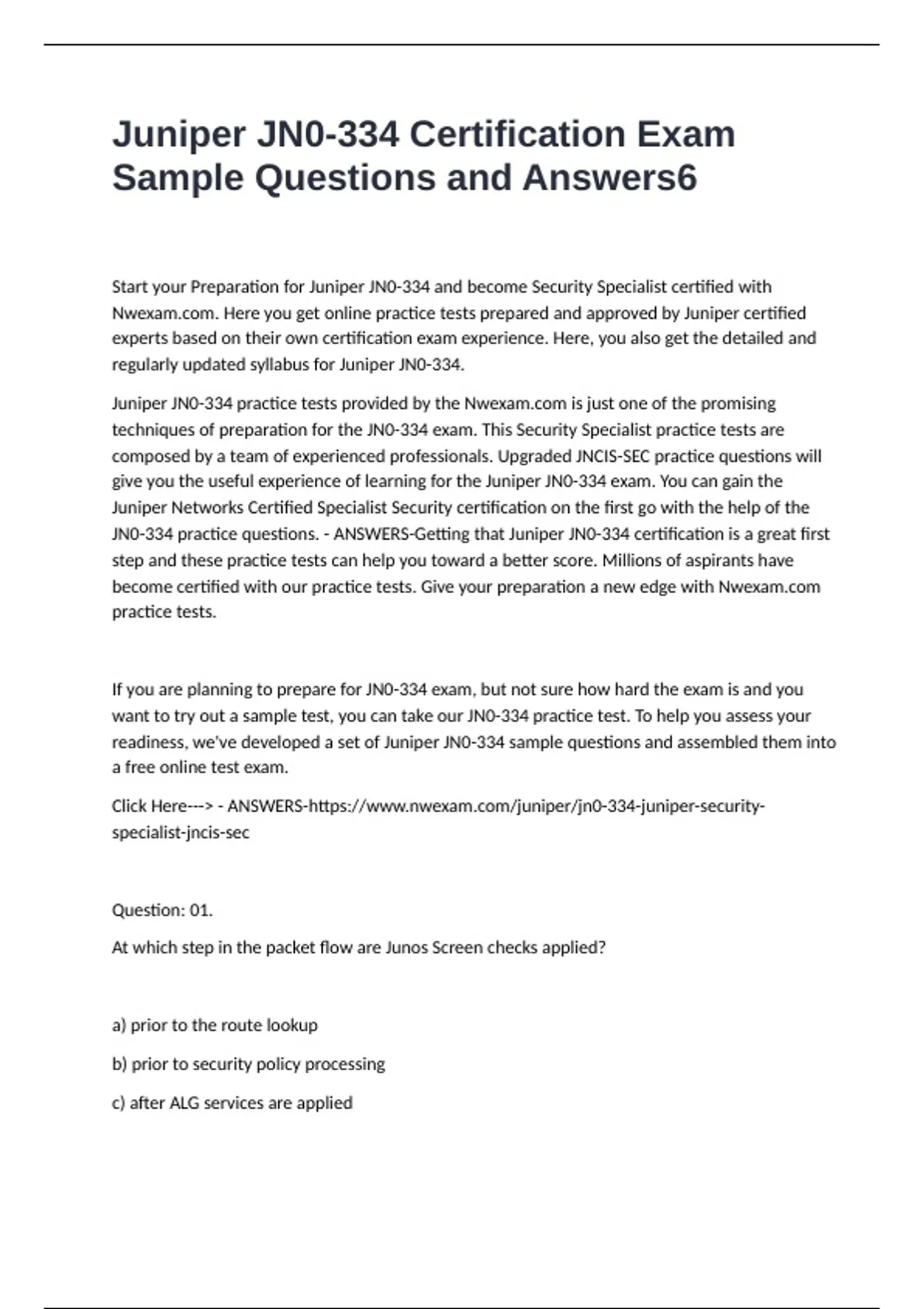 Juniper JN0-334 Certification Exam Sample Questions and Answers Start your Preparation for Juniper JN0-334 and become Security Specialist certified with N. Here you get online practice tests prepared and approved by Juniper certified experts based on their own certification exam experience. Here, you also get the detailed and regularly updated syllabus for Juniper JN0-334. Juniper JN0-334 practice tests provided by the N is just one of the promising techniques of preparation for the JN0-334 exam. This Security Specialist practice tests are composed by a team of experienced professionals. Upgraded JNCIS-SEC practice questions will give you the useful experience of learning for the Juniper JN0-334 exam. You can gain the Juniper Networks Certified Specialist Security certification on the first go with the help of the JN0-334 practice questions. - ANSWERS-Getting that Juniper JN0-334 certification is a great first step and these practice tests can help you toward a better score. Millions of aspirants have become certified with our practice tests. Give your preparation a new edge with N practice tests. If you are planning to prepare for JN0-334 exam, but not sure how hard the exam is and you want to try out a sample test, you can take our JN0-334 practice test. To help you assess your readiness, we've developed a set of Juniper JN0-334 sample questions and assembled them into a free online test exam. Click Here---> - ANSWERS- Question: 01. At which step in the packet flow are Junos Screen checks applied? a) prior to the route lookup b) prior to security policy processing