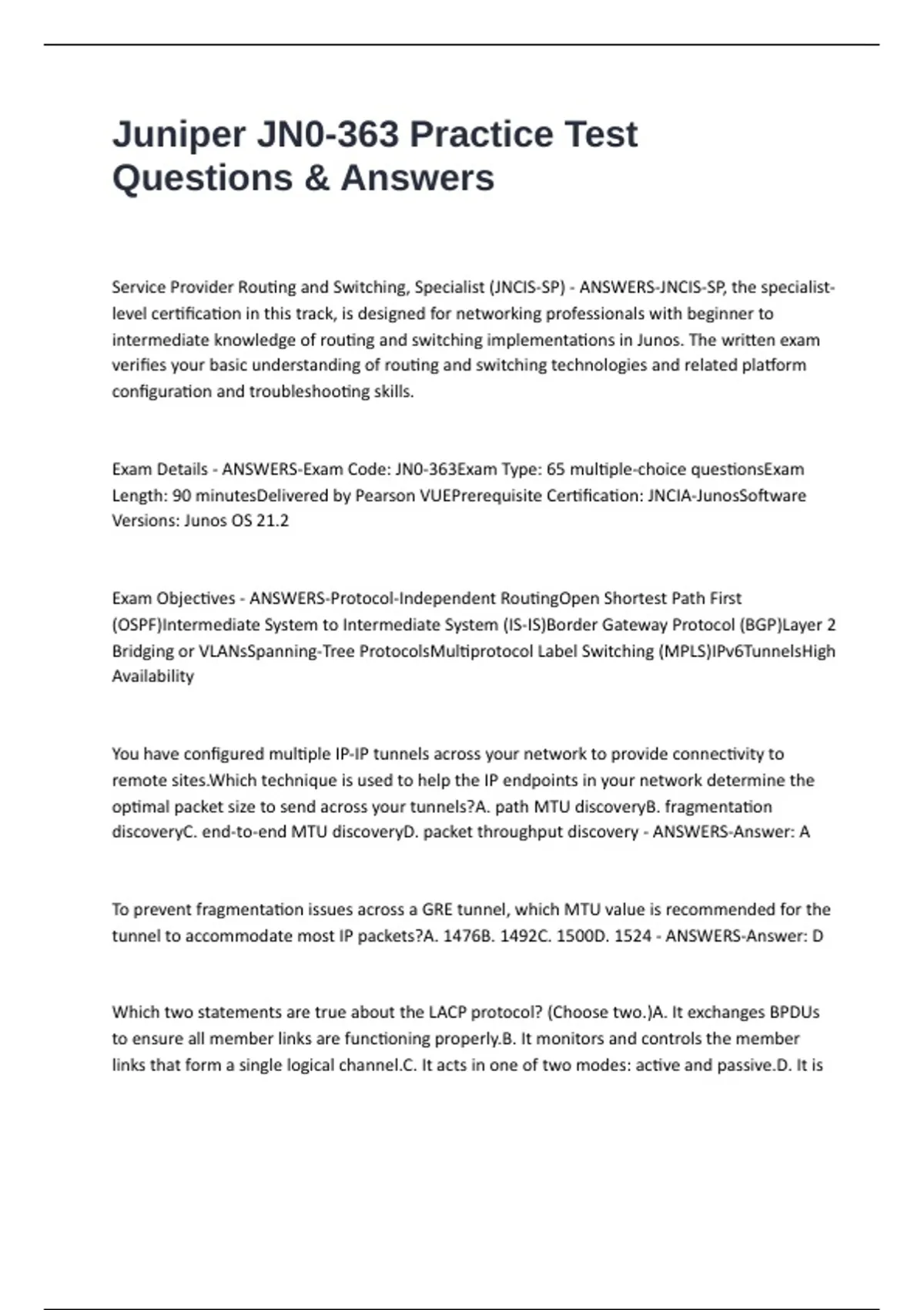 Exam Details - ANSWERS-Exam Code: JN0-363Exam Type: 65 multiple-choice questionsExam