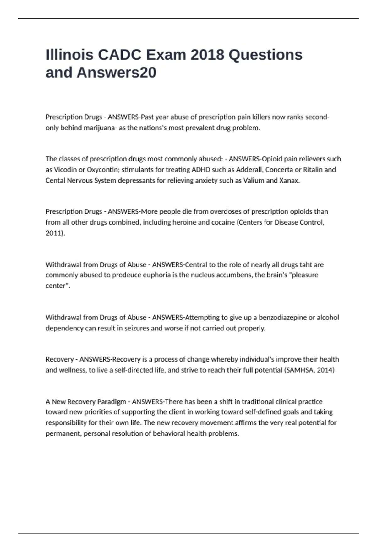 Illinois CADC Exam 2018 Questions and Answers Prescription Drugs - ANSWERS-Past year abuse of prescription pain killers now ranks second-only behind marijuana- as the nations's most prevalent drug problem. The classes of prescription drugs most commonly abused: - ANSWERS-Opioid pain relievers such as Vicodin or Oxycontin; stimulants for treating ADHD such as Adderall, Concerta or Ritalin and Cental Nervous System depressants for relieving anxiety such as Valium and Xanax. Prescription Drugs - ANSWERS-More people die from overdoses of prescription opioids than from all other drugs combined, including heroine and cocaine (Centers for Disease Control, 2011). Withdrawal from Drugs of Abuse - ANSWERS-Central to the role of nearly all drugs taht are commonly abused to prodeuce euphoria is the nucleus accumbens, the brain's "pleasure center". Withdrawal from Drugs of Abuse - ANSWERS-Attempting to give up a benzodiazepine or alcohol dependency can result in seizures and worse if not carried out properly. Recovery - ANSWERS-Recovery is a process of change whereby individual's improve their health and wellness, to live a self-directed life, and strive to reach their full potential (SAMHSA, 2014) A New Recovery Paradigm - ANSWERS-There has been a shift in traditional clinical practice toward new priorities of supporting the client in working toward self-defined goals and taking responsibility for their own life. The new recovery movement affirms the very real potential for permanent, personal resolution of behavioral health problems.