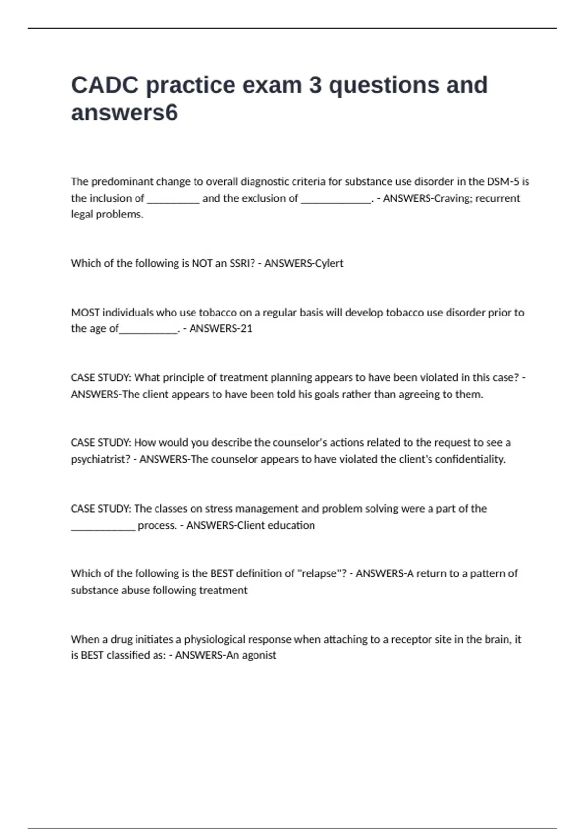 CADC practice exam 3 questions and answers The predominant change to overall diagnostic criteria for substance use disorder in the DSM-5 is the inclusion of _________ and the exclusion of ____________. - ANSWERS-Craving; recurrent legal problems. Which of the following is NOT an SSRI? - ANSWERS-Cylert MOST individuals who use tobacco on a regular basis will develop tobacco use disorder prior to the age of__________. - ANSWERS-21 CASE STUDY: What principle of treatment planning appears to have been violated in this case? - ANSWERS-The client appears to have been told his goals rather than agreeing to them. CASE STUDY: How would you describe the counselor's actions related to the request to see a psychiatrist? - ANSWERS-The counselor appears to have violated the client's confidentiality. CASE STUDY: The classes on stress management and problem solving were a part of the ___________ process. - ANSWERS-Client education Which of the following is the BEST definition of "relapse"? - ANSWERS-A return to a pattern of substance abuse following treatment When a drug initiates a physiological response when attaching to a receptor site in the brain, it is BEST classified as: - ANSWERS-An agonist