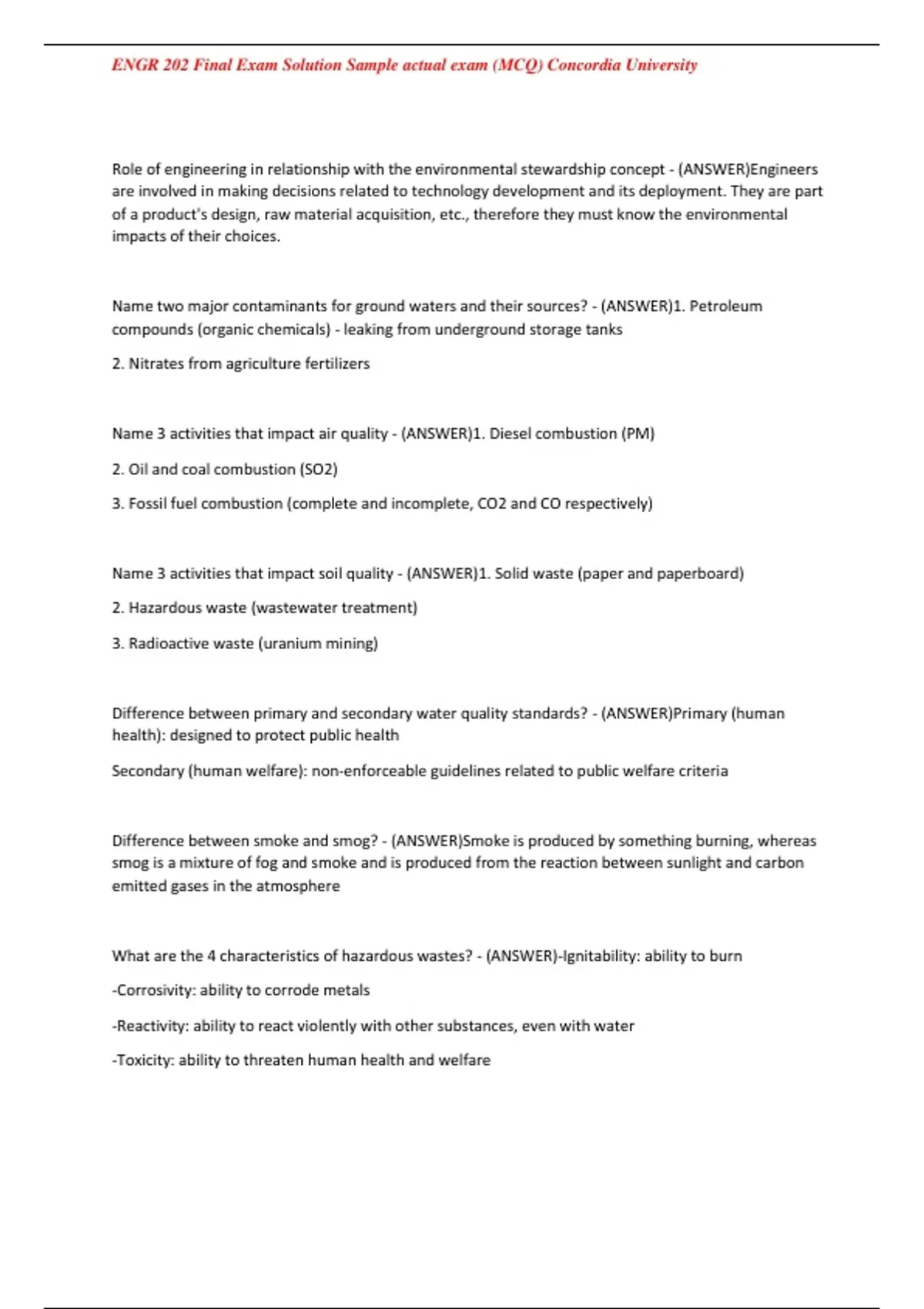 , ENGR 202 Final Exam Solution Sample actual exam (MCQ) Concordia University