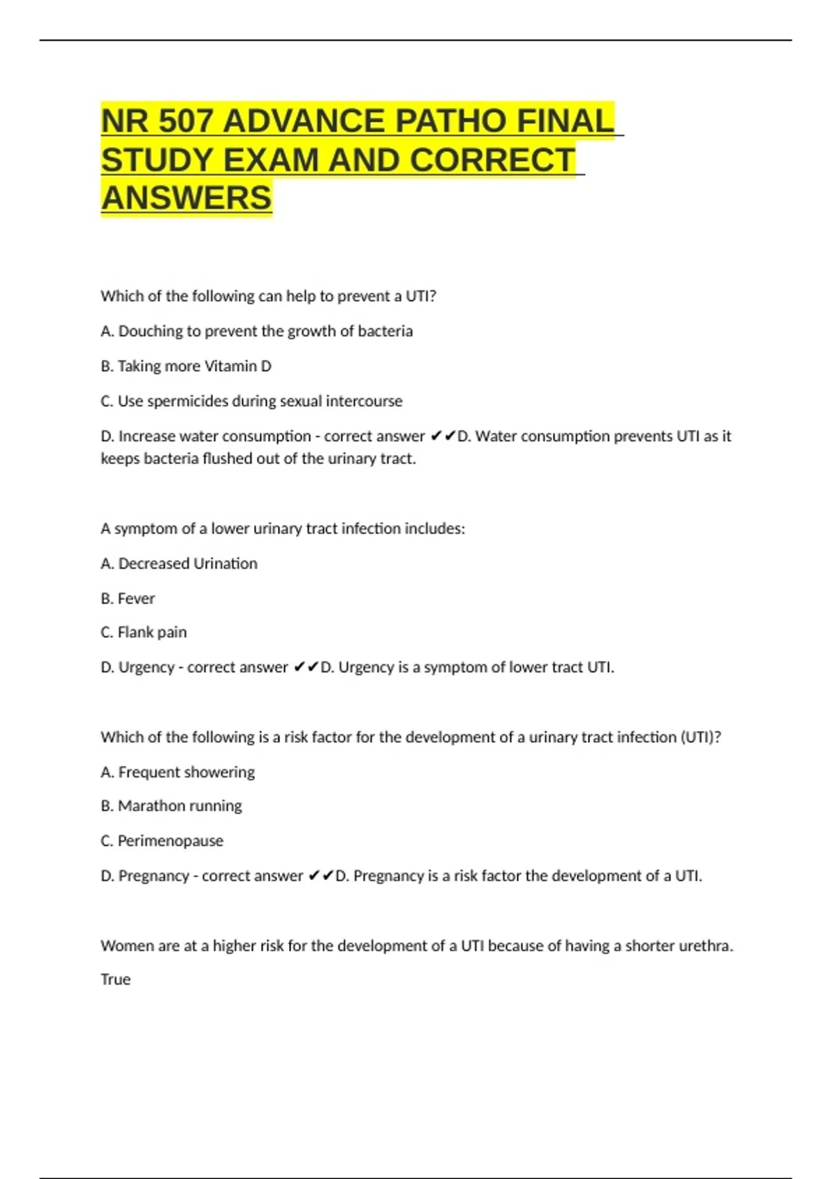 D. Pregnancy - correct answer ✔✔D. Pregnancy is a risk factor the development of a UTI.