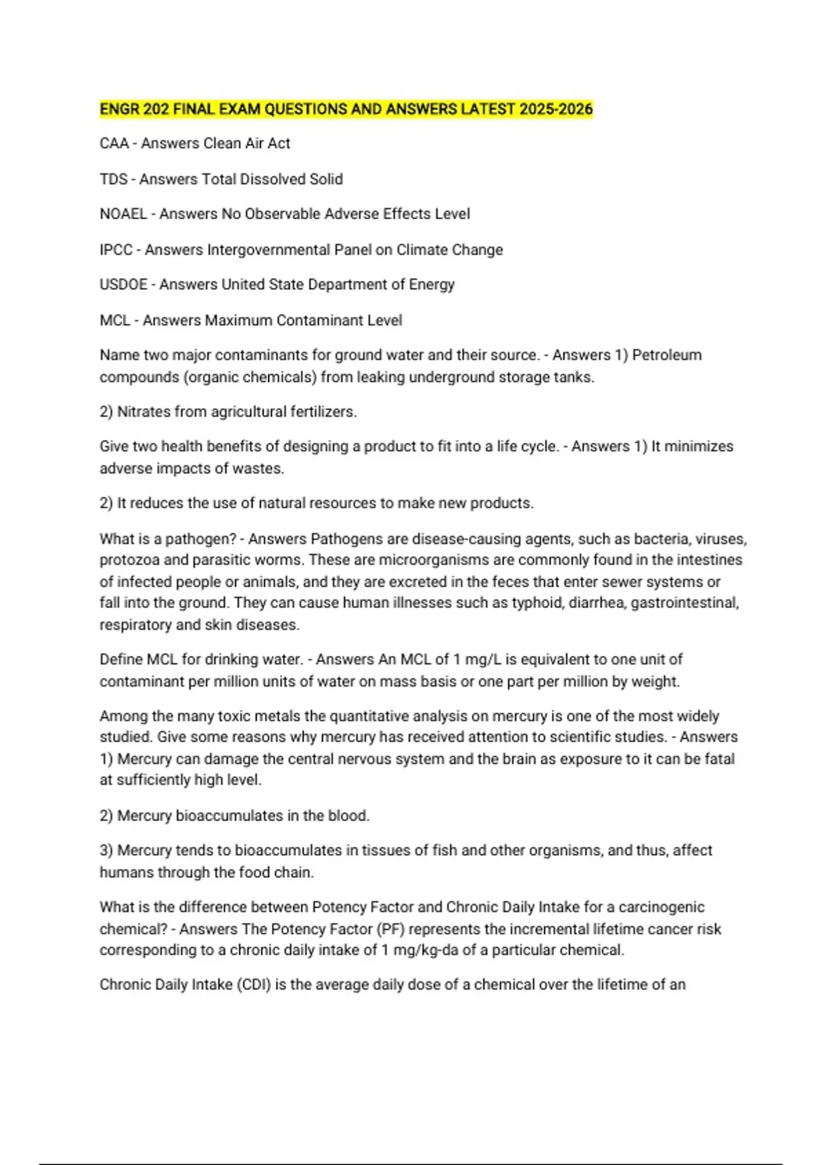 ENGR 202 FINAL EXAM QUESTIONS AND ANSWERS LATEST CAA - Answers Clean Air Act TDS - Answers Total Dissolved Solid NOAEL - Answers No Observable Adverse Effects Level IPCC - Answers Intergovernmental Panel on Climate Change USDOE - Answers United State Department of Energy MCL - Answers Maximum Contaminant Level Name two major contaminants for ground water and their source. - Answers 1) Petroleum compounds (organic chemicals) from leaking underground storage tanks. 2) Nitrates from agricultural fertilizers. Give two health benefits of designing a product to fit into a life cycle. - Answers 1) It minimizes adverse impacts of wastes. 2) It reduces the use of natural resources to make new products. What is a pathogen? - Answers Pathogens are disease-causing agents, such as bacteria, viruses, protozoa and parasitic worms. These are microorganisms are commonly found in the intestines of infected people or animals, and they are excreted in the feces that enter sewer systems or fall into the ground. They can cause human illnesses such as typhoid, diarrhea, gastrointestinal, respiratory and skin diseases. Define MCL for drinking water. - Answers An MCL of 1 mg/L is equivalent to one unit of contaminant per million units of water on mass basis or one part per million by weight. Among the many toxic metals the quantitative analysis on mercury is one of the most widely studied. Give some reasons why mercury has received attention to scientific studies. - Answers 1) Mercury can damage the central nervous system and the brain as exposure to it can be fatal at sufficiently high level. 2) Mercury bioaccumulates in the blood. 3) Mercury tends to bioaccumulates in tissues of fish and other organisms, and thus, affect humans through the food chain. What is the difference between Potency Factor and Chronic Daily Intake for a carcinogenic chemical? - Answers The Potency Factor (PF) represents the incremental lifetime cancer risk corresponding to a chronic daily intake of 1 mg/kg-da of a particular chemical. Chronic Daily Intake (CDI) is the average daily dose of a chemical over the lifetime of an individual. Explain some of the uncertainties in assessing for non-carcinogens. - Answers The Reference Dose is a key parameter used in risk assessments to characterize the safe dose of a non-carcinogenic chemical. Hazard Quotient (HQ) is the metric used in risk assessments to compare an actual dose of chemical to the reference dose. It is defined as the ratio of the average daily dose (ADD) of a chemical divided by the reference dose. What are the 3 major factors affecting increase in CO2 emissions? - Answers 1) Population growth 2) GDP per capita 3) Energy intensity What is bioaccumulation? - Answers It is the accumulation of substances such as pesticides and other organic chemicals in an organism. (ex: Mercury). What is Hazard Quotient (HQ)? - Answers It is the metric used in risk assessments to compare an actual dose of a chemical to the reference dose. It is defined as the ratio of the average daily dose (ADD) of a chemical divided by the reference dose. HQ = ADD/RfD What are the 3 key factors that influence the environmental change? - Answers 1) Housing and industrial development 2) Agriculture 3) Emissions of chemical substances to land, air and water The population of a city is currently 1 million people. Using a constant annual growth rate, what is the percent increase in population after 10 years with an annual growth rate of 5%? - Answers P = Po(1+r)^10 P = 1,000,000 (1+0.05)^(10) P = 1,628,894.63 (P-Po)/P*100 = 62.89%