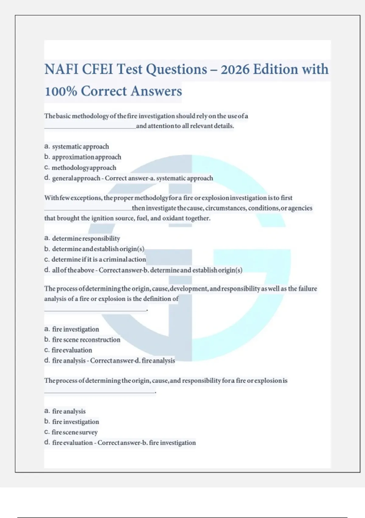 This document contains the updated 2026 set of NAFI Certified Fire & Explosion Investigator (CFEI) test questions with fully accurate, verified answers. It covers all core areas of the CFEI competency framework, including fire behavior, explosion dynamics, investigative methodology, scene documentation, and evidence evaluation. The material is designed to support comprehensive exam preparation and ensure clear understanding of investigative principles and procedures.