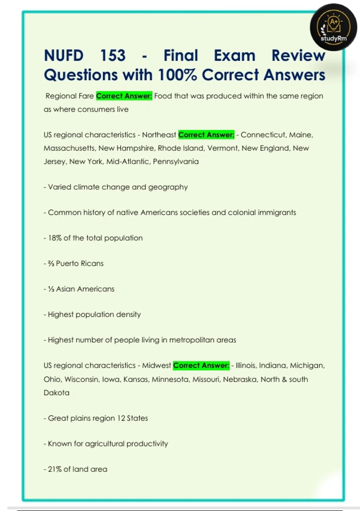 NUFD 153 - Final Exam Review Questions with 100% Correct Answers