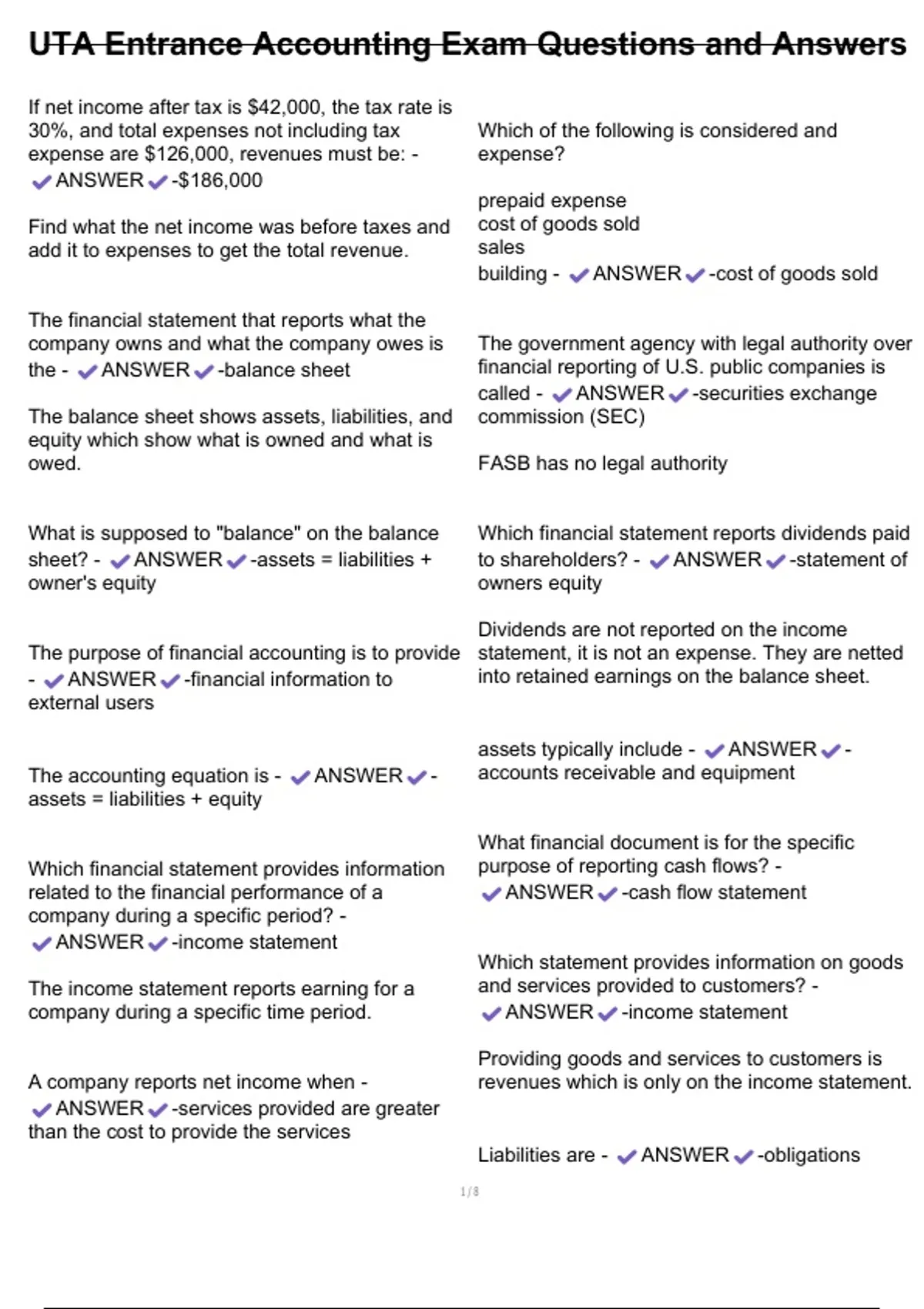 , UTA Entrance Accounting Exam Questions and Answers