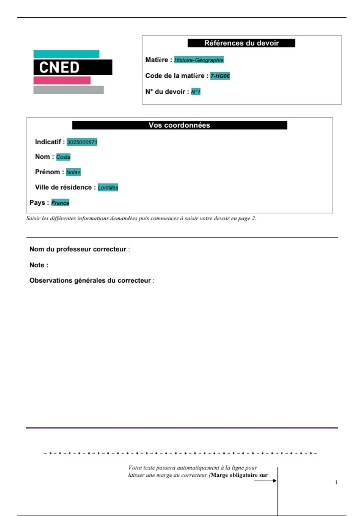 Saisir les différentes informations demandées puis commencez à saisir votre devoir en page 2.