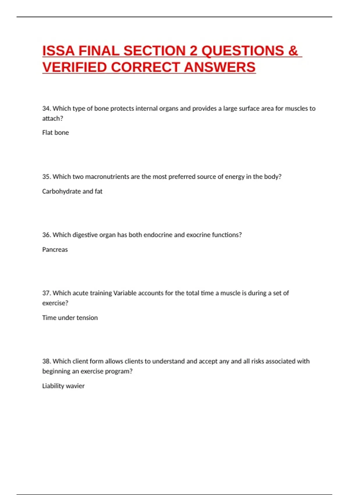 ISSA FINAL SECTION 2 QUESTIONS & VERIFIED CORRECT ANSWERS flagship program offered by the International Sports Sciences Association. It’s designed to prepare learners to become professional fitness trainers with a strong foundation in exercise science, coaching, and program design.