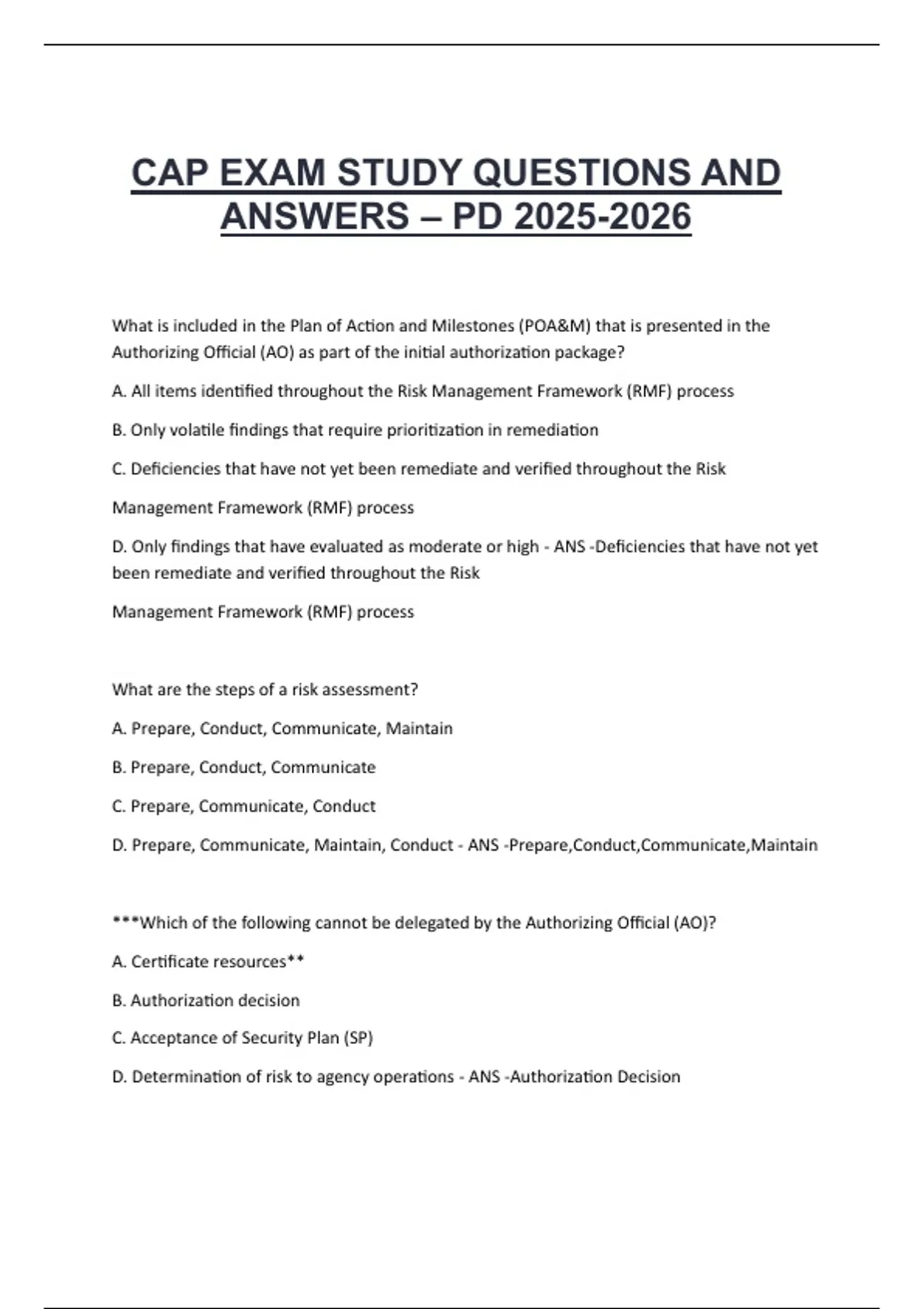 CAP EXAM STUDY QUESTIONS AND